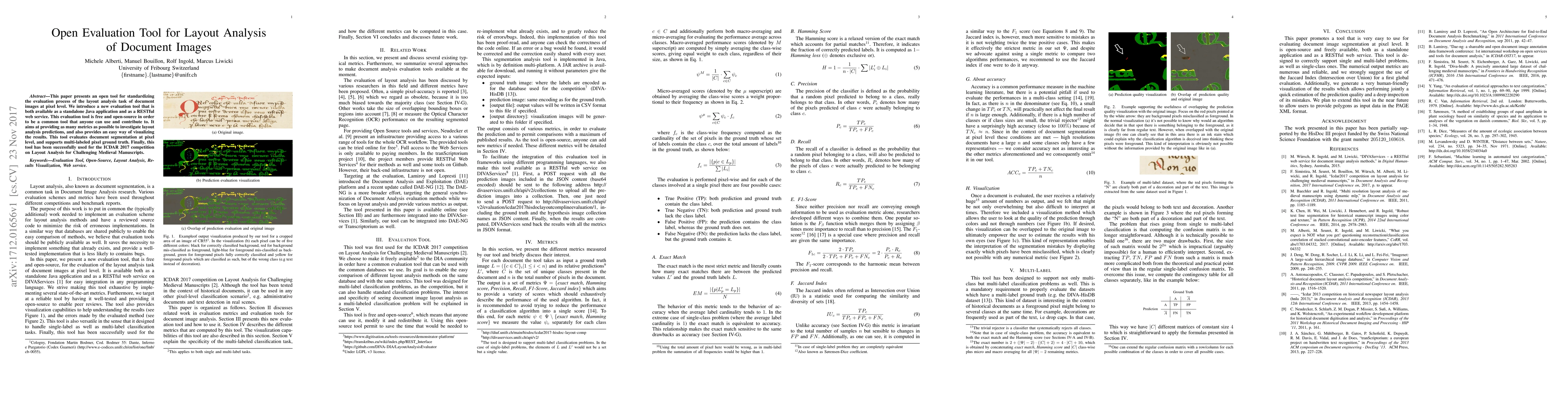 This paper introduces an open evaluation tool for assessing layout analysis in document images, available as a Java application and RESTful web service. It offers various metrics and visualizations for pixel-level segmentation and has been utilized in the ICDAR2017 competition.