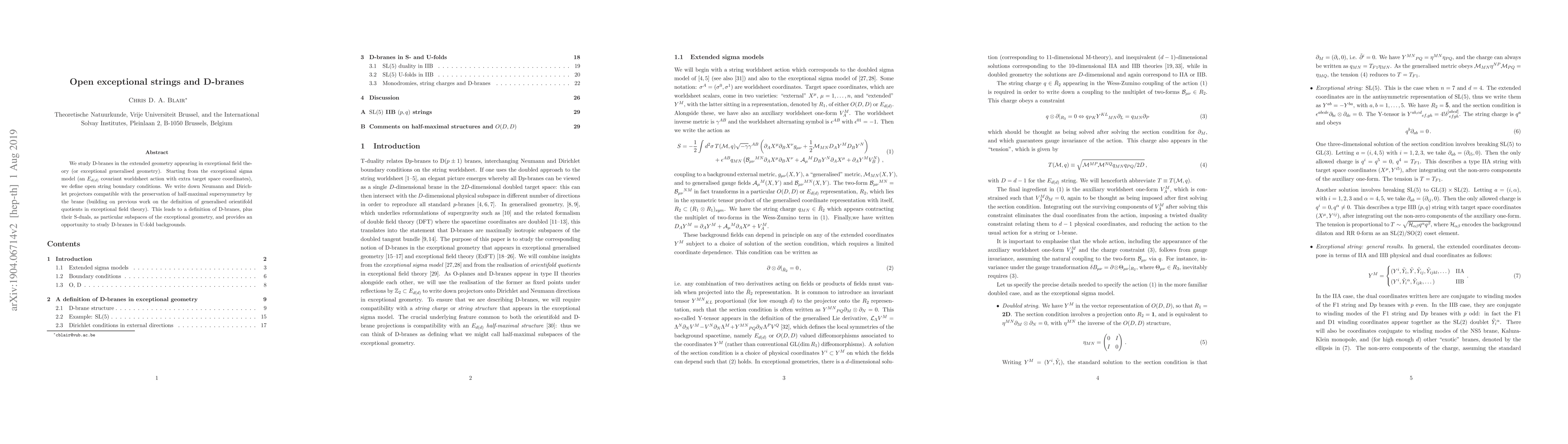 We study D-branes in the extended geometry appearing in exceptional field theory (or exceptional generalised geometry). Starting from the exceptional sigma model (an $E_{d(d)}$ covariant worldsheet action with extra target space coordinates), we define open string boundary conditions. We write down Neumann and Dirichlet projectors compatible with the preservation of half-maximal supersymmetry by the brane (building on previous work on the definition of generalised orientifold quotients in exceptional field theory). This leads to a definition of D-branes, plus their S-duals, as particular subspaces of the exceptional geometry, and provides an opportunity to study D-branes in U-fold backgrounds.