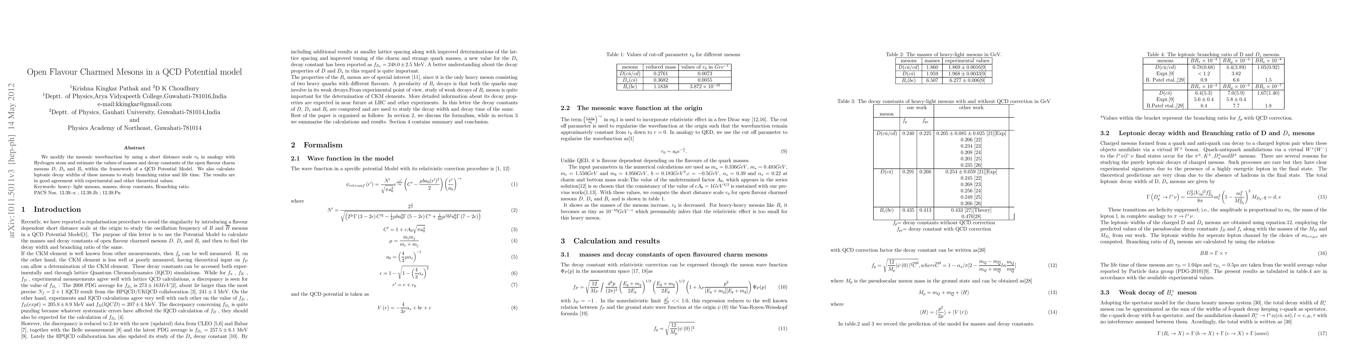 We modify the mesonic wavefunction by using a short distance scale r0 in analogy with Hydrogen atom and estimate the values of masses and decay constants of the open flavour charm mesons D, Ds and Bc within the framework of a QCD Potential Model. We also calculate leptonic decay widths of these mesons to study branching ratios and life time. The results are in good agreement with experimental and other theoretical values.