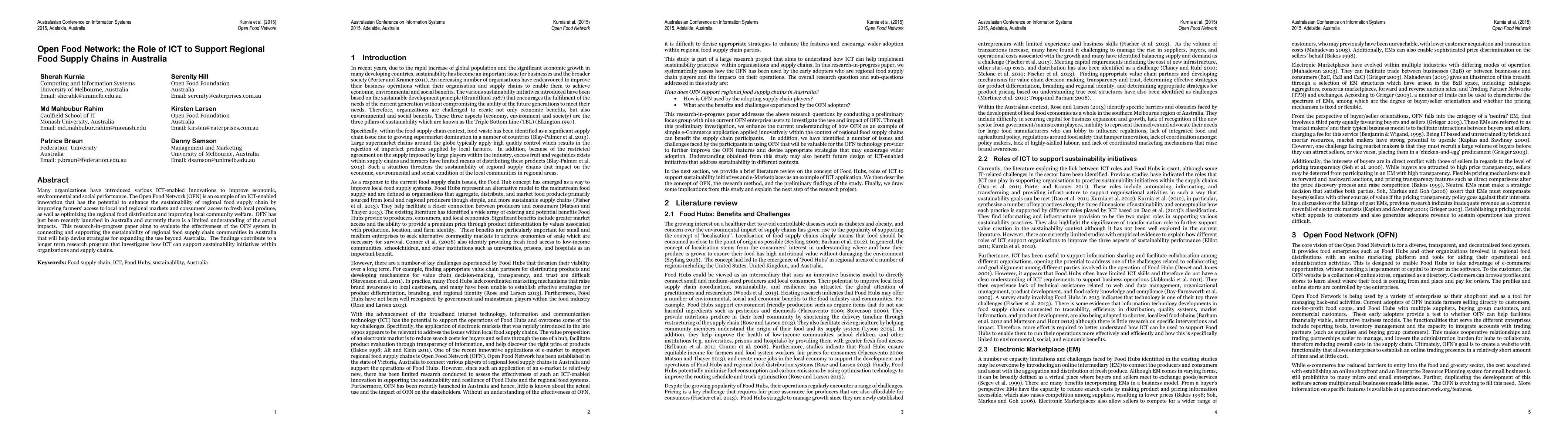 Many organizations have introduced various ICT-enabled innovations to improve economic, environmental and social performance. The Open Food Network (OFN) is an example of ICT-enabled innovation that has the potential to enhance the sustainability of regional food supply chain by improving farmers access to local and regional markets and consumers access to fresh local produce, as well as optimizing the regional food distribution and improving local community welfare. OFN has just been recently launched in Australia and currently there is a limited understanding of the actual impacts and appropriate strategies to encourage wider adoption. This research in progress aims to evaluate the effectiveness of the OFN system in connecting and supporting the sustainability of regional food supply chain communities in Australia that will help devise strategies for expanding the use beyond Australia. Through a preliminary focus group with a number of early adopters of the OFN, this study identifies the actual use of OFN, benefits to main stakeholders and a number of challenges. The findings contribute to a longer term research program that investigates how ICT can support sustainability initiatives within organizations and supply chains.