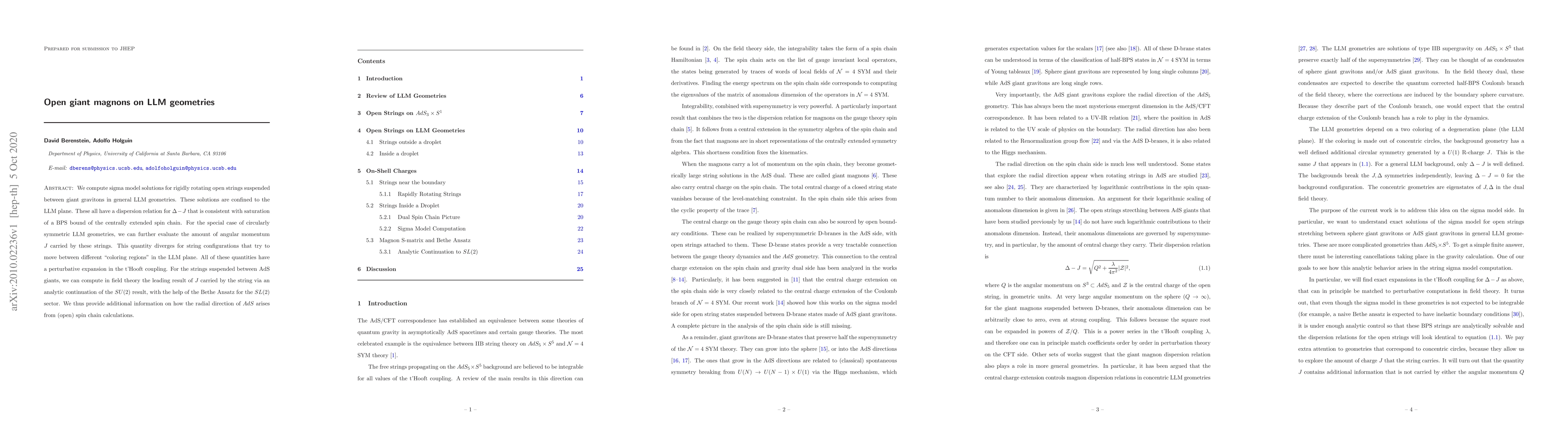 We compute sigma model solutions for rigidly rotating open strings suspended between giant gravitons in general LLM geometries. These solutions are confined to the LLM plane. These all have a dispersion relation for $\Delta-J$ that is consistent with saturation of a BPS bound of the centrally extended spin chain. For the special case of circularly symmetric LLM geometries, we can further evaluate the amount of angular momentum $J$ carried by these strings. This quantity diverges for string configurations that try to move between different "coloring regions" in the LLM plane. All of these quantities have a perturbative expansion in the t'Hooft coupling. For the strings suspended between AdS giants, we can compute in field theory the leading result of $J$ carried by the string via an analytic continuation of the $SU(2)$ result, with the help of the Bethe Ansatz for the $SL(2)$ sector. We thus provide additional information on how the radial direction of $AdS$ arises from (open) spin chain calculations.