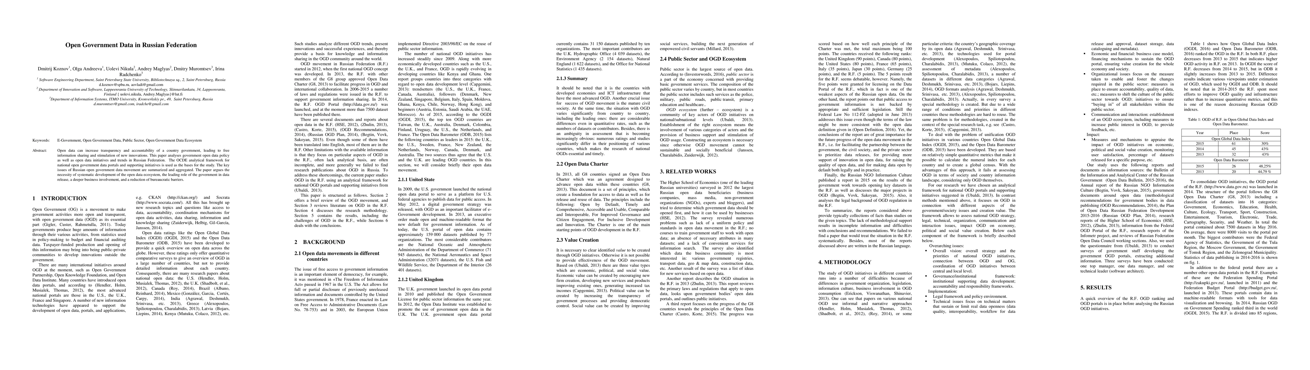 This paper analyzes the open government data policy and initiatives in the Russian Federation, emphasizing the need for systematic development of the open data ecosystem, government leadership, increased business involvement, and reduced bureaucratic barriers to enhance transparency and innovation.