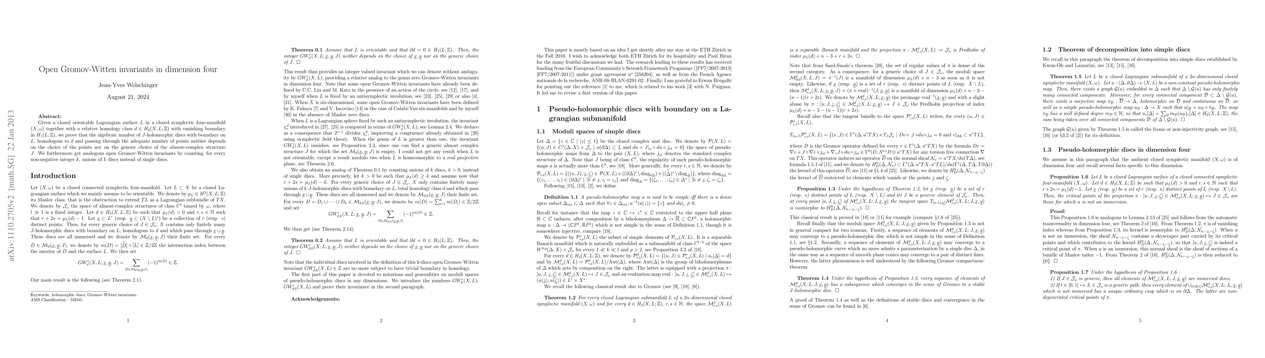 Given a closed orientable Lagrangian surface L in a closed symplectic four-manifold X together with a relative homology class d in H_2 (X, L; Z) with vanishing boundary in H_1 (L; Z), we prove that the algebraic number of J-holomorphic discs with boundary on L, homologous to d and passing through the adequate number of points neither depends on the choice of the points nor on the generic choice of the almost-complex structure J. We furthermore get analogous open Gromov-Witten invariants by counting, for every non-negative integer k, unions of k discs instead of single discs.
