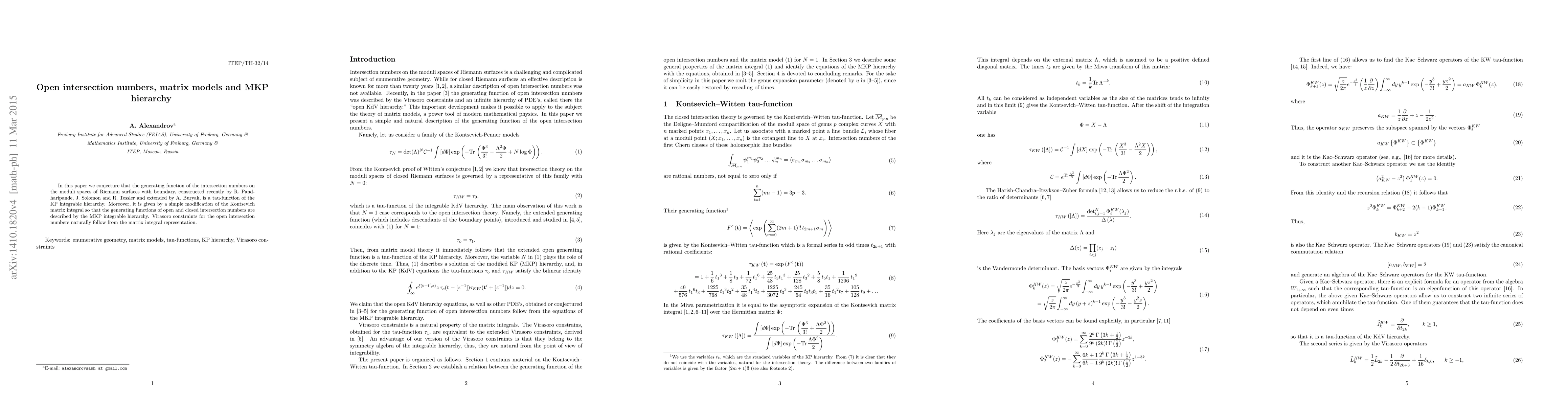 This paper conjectures that the generating function of intersection numbers on moduli spaces of Riemann surfaces with boundary is a tau-function of the KP hierarchy, derived from a modified Kontsevich matrix integral, and that Virasoro constraints for these numbers naturally emerge from this matrix integral representation.