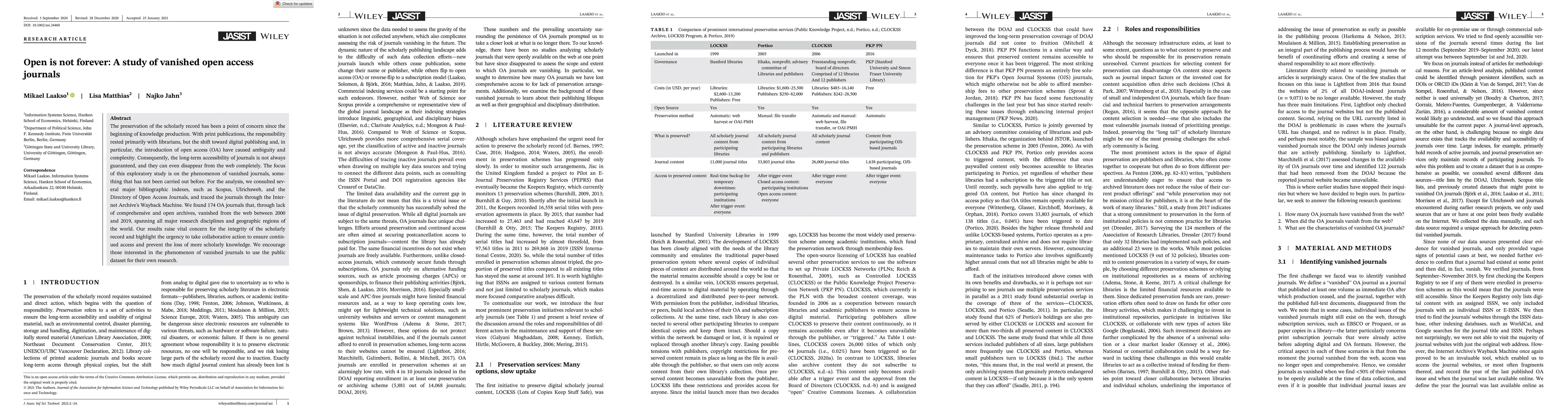 This study investigates the phenomenon of vanished open access journals, identifying 174 such journals that disappeared from the web between 2000 and 2019 due to lack of comprehensive archiving. The findings underscore the need for collaborative efforts to preserve the scholarly record and prevent further loss of knowledge.