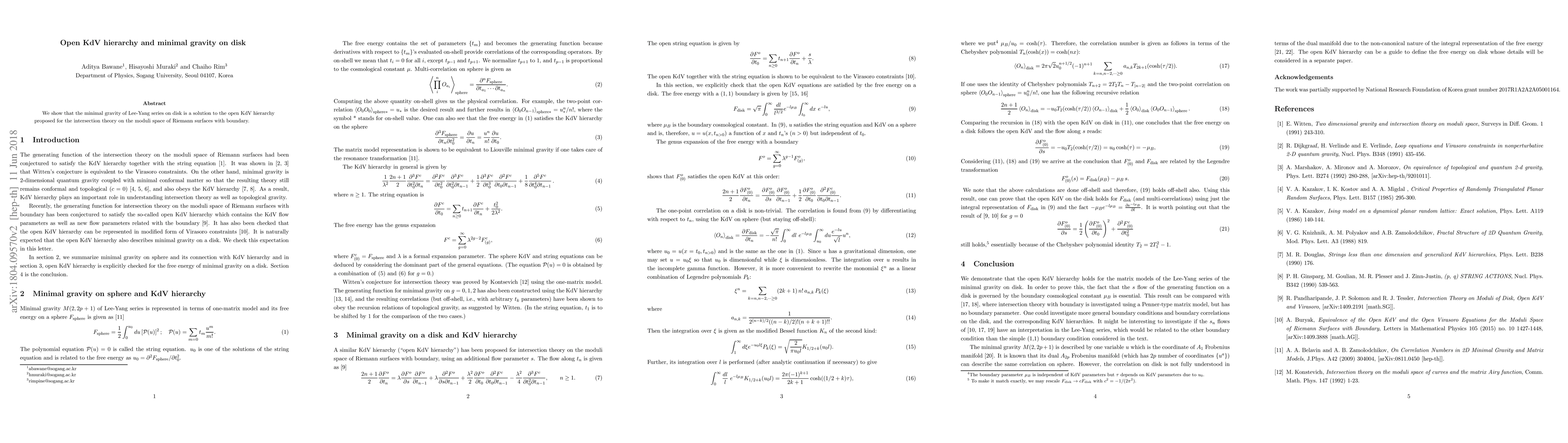 This research demonstrates the equivalence of the open KdV hierarchy and the Lee-Yang series of minimal gravity on the disk, with potential implications for our understanding of quantum gravity and conformal field theory.