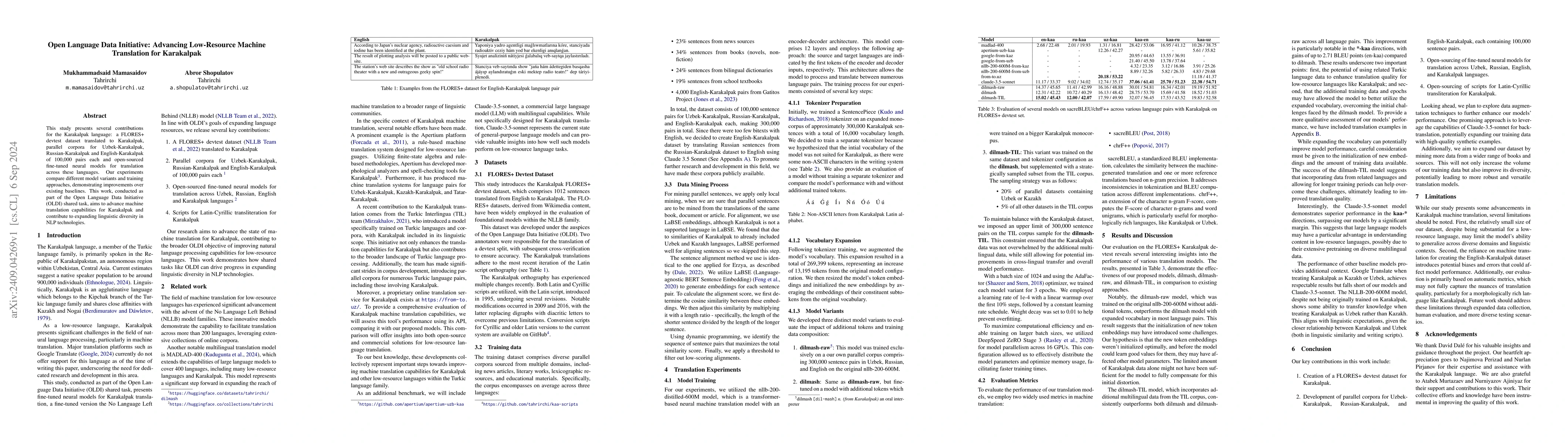 This study presents several contributions for the Karakalpak language: a FLORES+ devtest dataset translated to Karakalpak, parallel corpora for Uzbek-Karakalpak, Russian-Karakalpak and English-Karakalpak of 100,000 pairs each and open-sourced fine-tuned neural models for translation across these languages. Our experiments compare different model variants and training approaches, demonstrating improvements over existing baselines. This work, conducted as part of the Open Language Data Initiative (OLDI) shared task, aims to advance machine translation capabilities for Karakalpak and contribute to expanding linguistic diversity in NLP technologies.