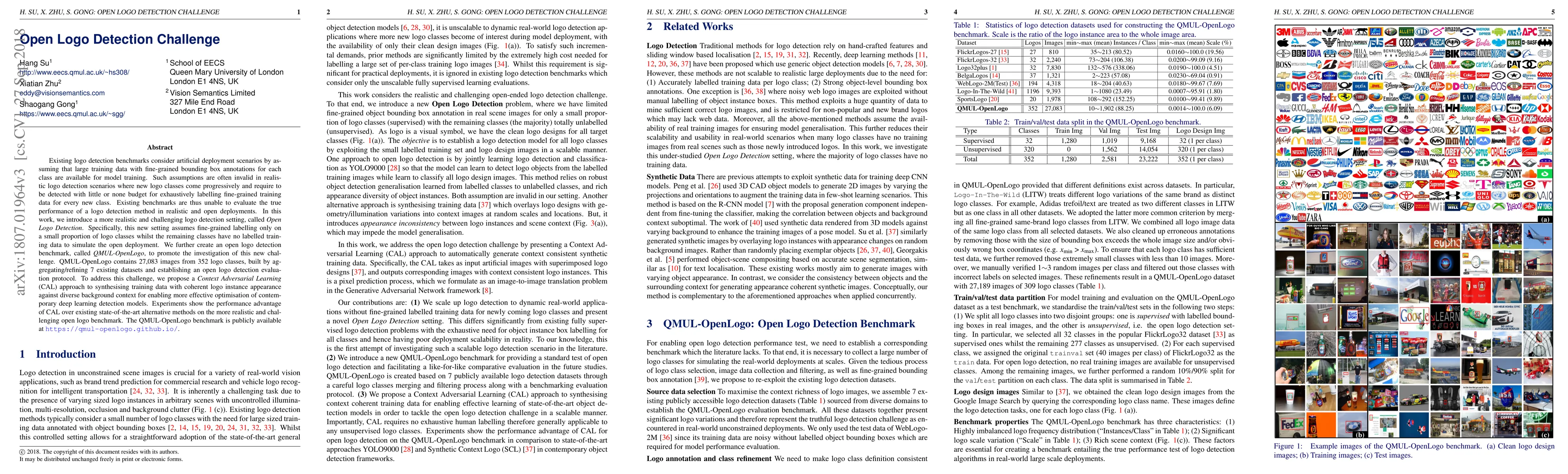 The paper introduces Open Logo Detection (OpenLogo), a benchmark for logo detection in realistic scenarios with limited labelled training data. It proposes Context Adversarial Learning (CAL) to synthesize training data, enhancing deep learning detection model generalization.
