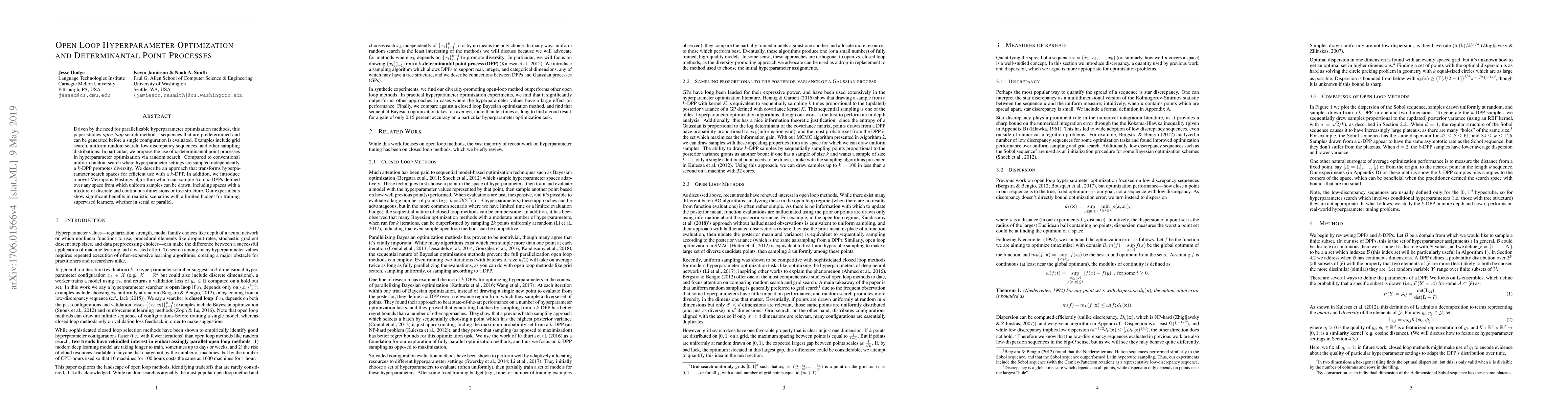 This paper proposes using k-determinantal point processes for hyperparameter optimization via random search, offering benefits in diversity compared to uniform random search. It introduces a novel Metropolis-Hastings algorithm for sampling from k-DPPs over complex spaces.