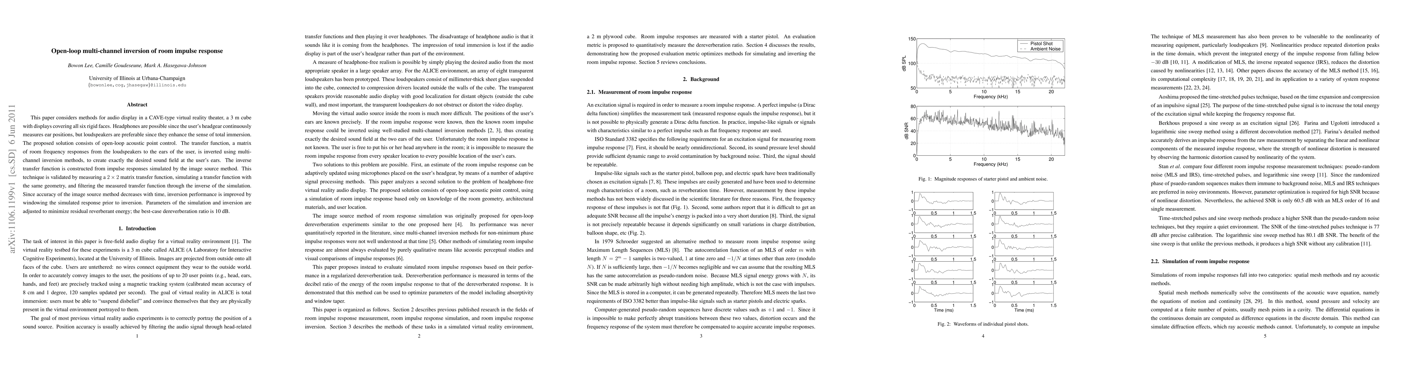 This paper considers methods for audio display in a CAVE-type virtual reality theater, a 3 m cube with displays covering all six rigid faces. Headphones are possible since the user's headgear continuously measures ear positions, but loudspeakers are preferable since they enhance the sense of total immersion. The proposed solution consists of open-loop acoustic point control. The transfer function, a matrix of room frequency responses from the loudspeakers to the ears of the user, is inverted using multi-channel inversion methods, to create exactly the desired sound field at the user's ears. The inverse transfer function is constructed from impulse responses simulated by the image source method. This technique is validated by measuring a 2x2 matrix transfer function, simulating a transfer function with the same geometry, and filtering the measured transfer function through the inverse of the simulation. Since accuracy of the image source method decreases with time, inversion performance is improved by windowing the simulated response prior to inversion. Parameters of the simulation and inversion are adjusted to minimize residual reverberant energy; the best-case dereverberation ratio is 10 dB.
