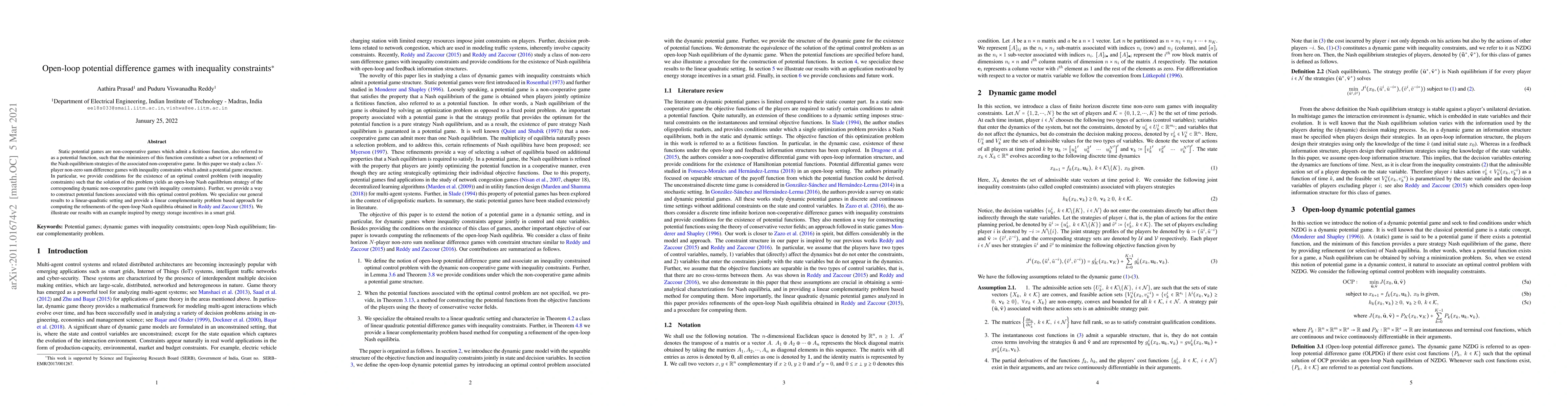 Static potential games are non-cooperative games which admit a fictitious function, also referred to as a potential function, such that the minimizers of this function constitute a subset (or a refinement) of the Nash equilibrium strategies of the associated non-cooperative game. In this paper, we study a class $N$-player non-zero sum difference games with inequality constraints which admit a potential game structure. In particular, we provide conditions for the existence of an optimal control problem (with inequality constraints) such that the solution of this problem yields an open-loop Nash equilibrium strategy of the corresponding dynamic non-cooperative game (with inequality constraints). Further, we provide a way to construct potential functions associated with this optimal control problem. We specialize our general results to a linear-quadratic setting and provide a linear complementarity problem-based approach for computing the refinements of the open-loop Nash equilibria. We illustrate our results with an example inspired by energy storage incentives in a smart grid.