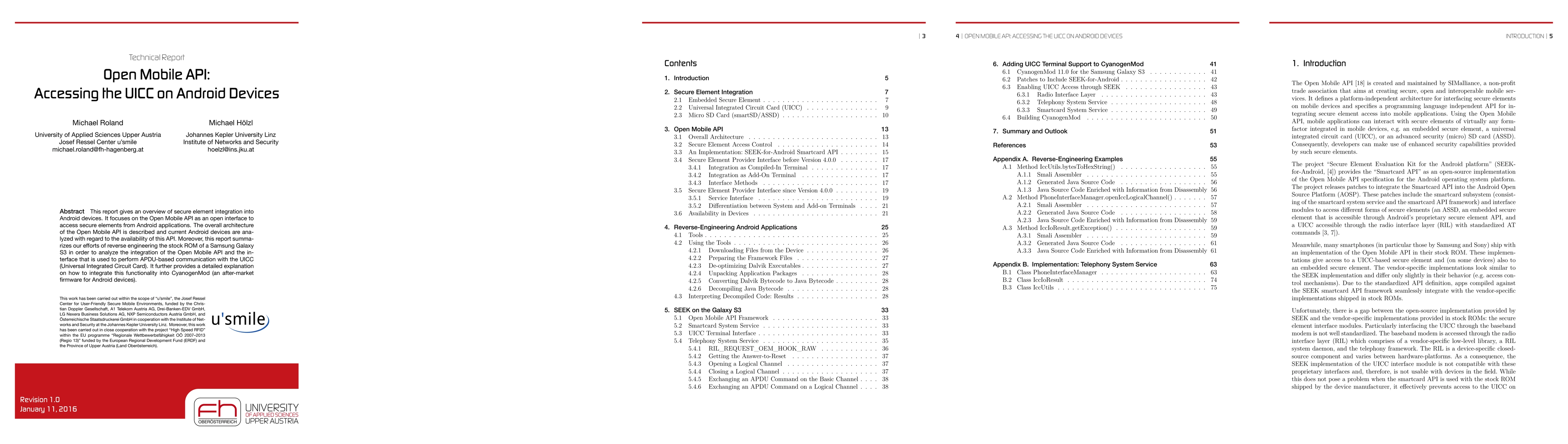 This paper explores the Open Mobile API for accessing Android's secure elements, detailing its architecture and integration into current devices. It also describes reverse engineering efforts on a Samsung Galaxy S3 to understand the API's UICC communication and provides guidance on integrating this functionality into CyanogenMod.