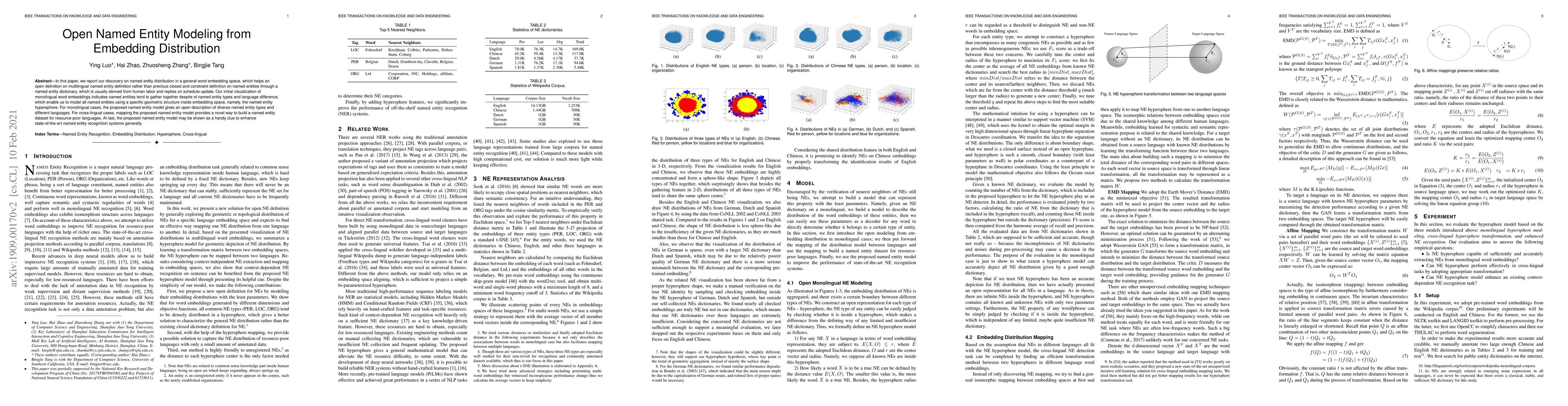 In this paper, we report our discovery on named entity distribution in a general word embedding space, which helps an open definition on multilingual named entity definition rather than previous closed and constraint definition on named entities through a named entity dictionary, which is usually derived from human labor and replies on schedule update. Our initial visualization of monolingual word embeddings indicates named entities tend to gather together despite of named entity types and language difference, which enable us to model all named entities using a specific geometric structure inside embedding space, namely, the named entity hypersphere. For monolingual cases, the proposed named entity model gives an open description of diverse named entity types and different languages. For cross-lingual cases, mapping the proposed named entity model provides a novel way to build a named entity dataset for resource-poor languages. At last, the proposed named entity model may be shown as a handy clue to enhance state-of-the-art named entity recognition systems generally.