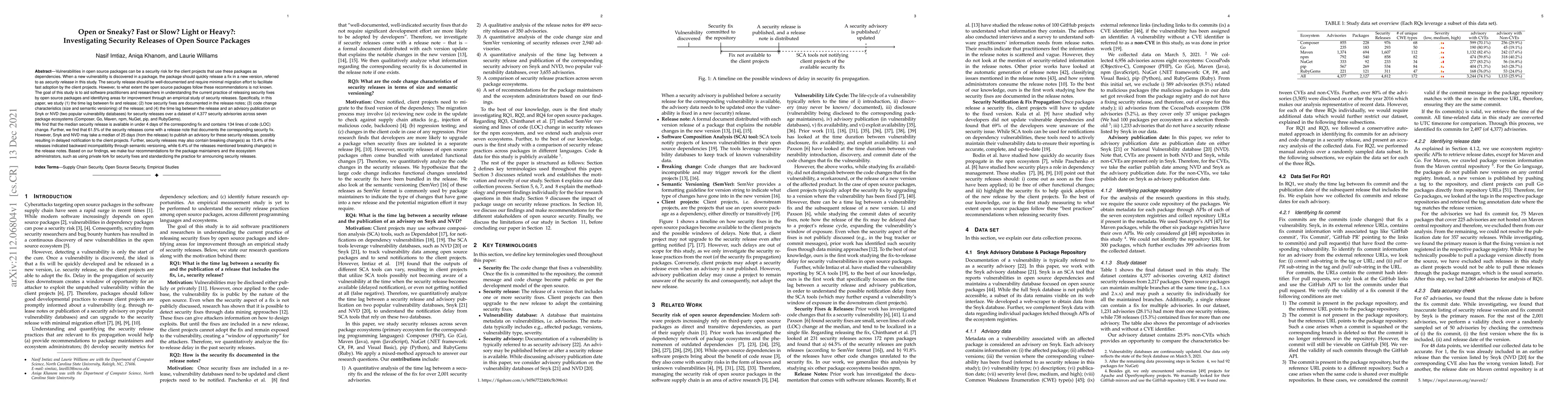 This study investigates the practices of open source packages in releasing security fixes, focusing on time lags, documentation, code changes, and advisory publication delays. The findings reveal that while most security releases occur within four days of the fix, only 61.5% have adequate documentation, and vulnerability advisories may be delayed by up to 25 days, suggesting room for improvement in notification timeliness.