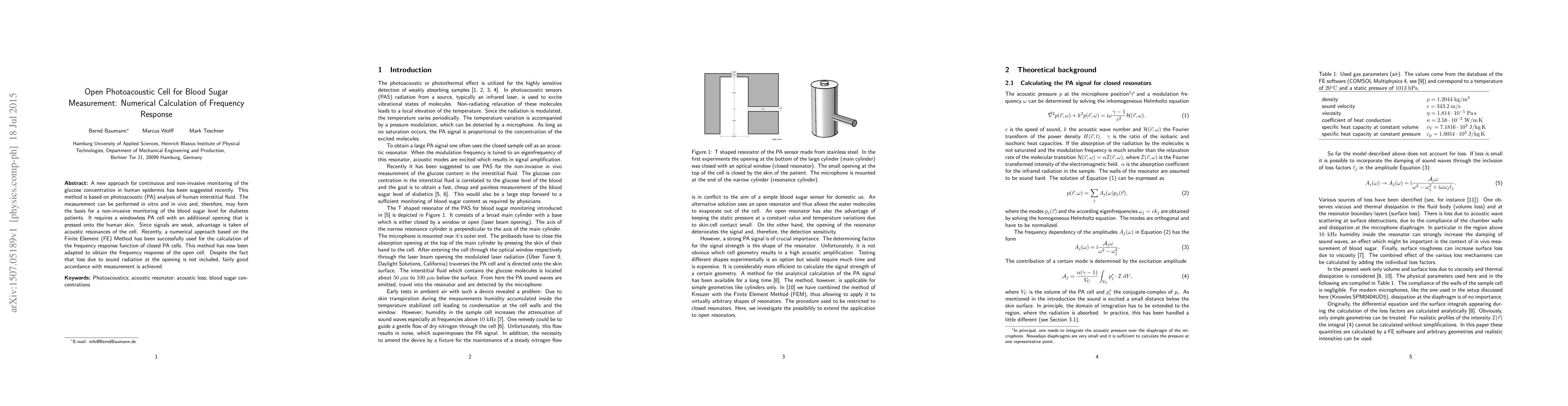 This paper proposes a non-invasive method for continuous glucose monitoring using photoacoustic analysis of interstitial fluid, employing an open PA cell. The frequency response of the open cell is numerically calculated using the Finite Element Method, achieving good agreement with measurements despite not accounting for sound radiation losses.
