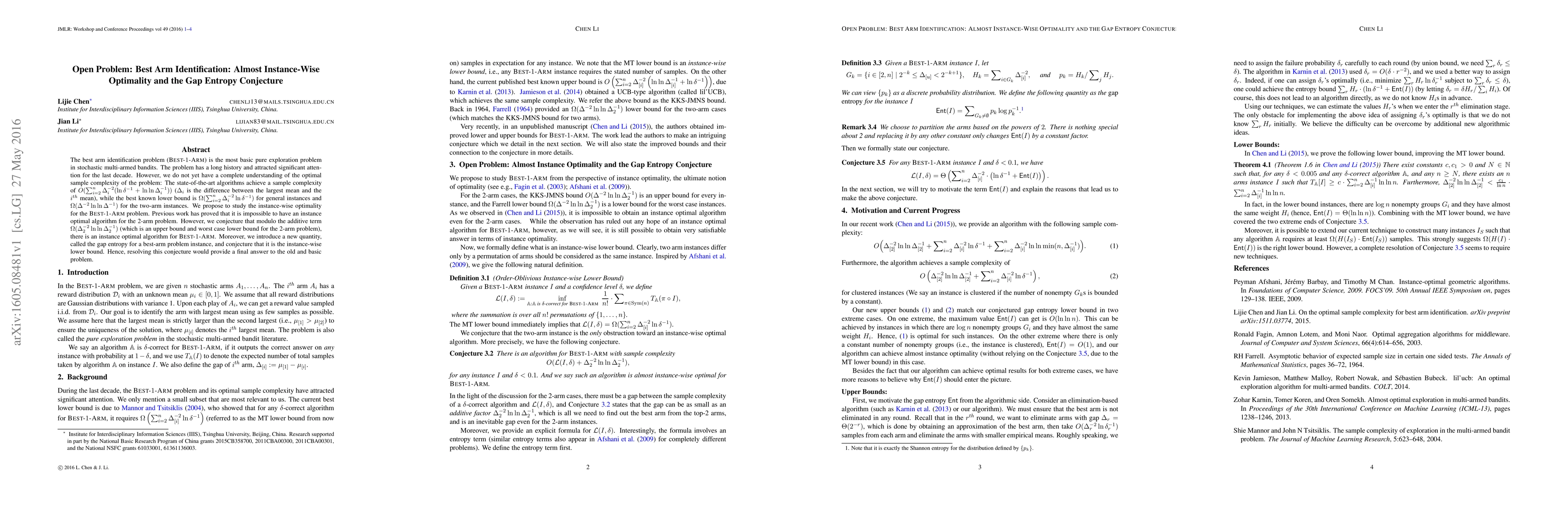 The best arm identification problem (BEST-1-ARM) is the most basic pure exploration problem in stochastic multi-armed bandits. The problem has a long history and attracted significant attention for the last decade. However, we do not yet have a complete understanding of the optimal sample complexity of the problem: The state-of-the-art algorithms achieve a sample complexity of $O(\sum_{i=2}^{n} \Delta_{i}^{-2}(\ln\delta^{-1} + \ln\ln\Delta_i^{-1}))$ ($\Delta_{i}$ is the difference between the largest mean and the $i^{th}$ mean), while the best known lower bound is $\Omega(\sum_{i=2}^{n} \Delta_{i}^{-2}\ln\delta^{-1})$ for general instances and $\Omega(\Delta^{-2} \ln\ln \Delta^{-1})$ for the two-arm instances. We propose to study the instance-wise optimality for the BEST-1-ARM problem. Previous work has proved that it is impossible to have an instance optimal algorithm for the 2-arm problem. However, we conjecture that modulo the additive term $\Omega(\Delta_2^{-2} \ln\ln \Delta_2^{-1})$ (which is an upper bound and worst case lower bound for the 2-arm problem), there is an instance optimal algorithm for BEST-1-ARM. Moreover, we introduce a new quantity, called the gap entropy for a best-arm problem instance, and conjecture that it is the instance-wise lower bound. Hence, resolving this conjecture would provide a final answer to the old and basic problem.