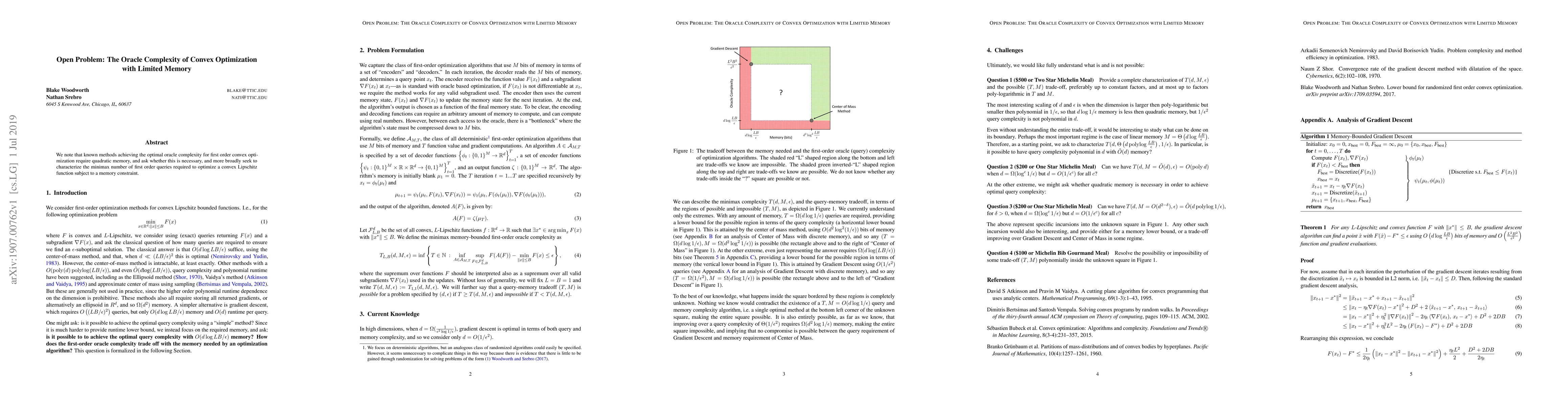 Summary: This paper explores whether optimal oracle complexity for first-order convex optimization methods necessitates quadratic memory and aims to determine the minimax number of first-order queries needed to optimize convex Lipschitz functions under memory constraints.