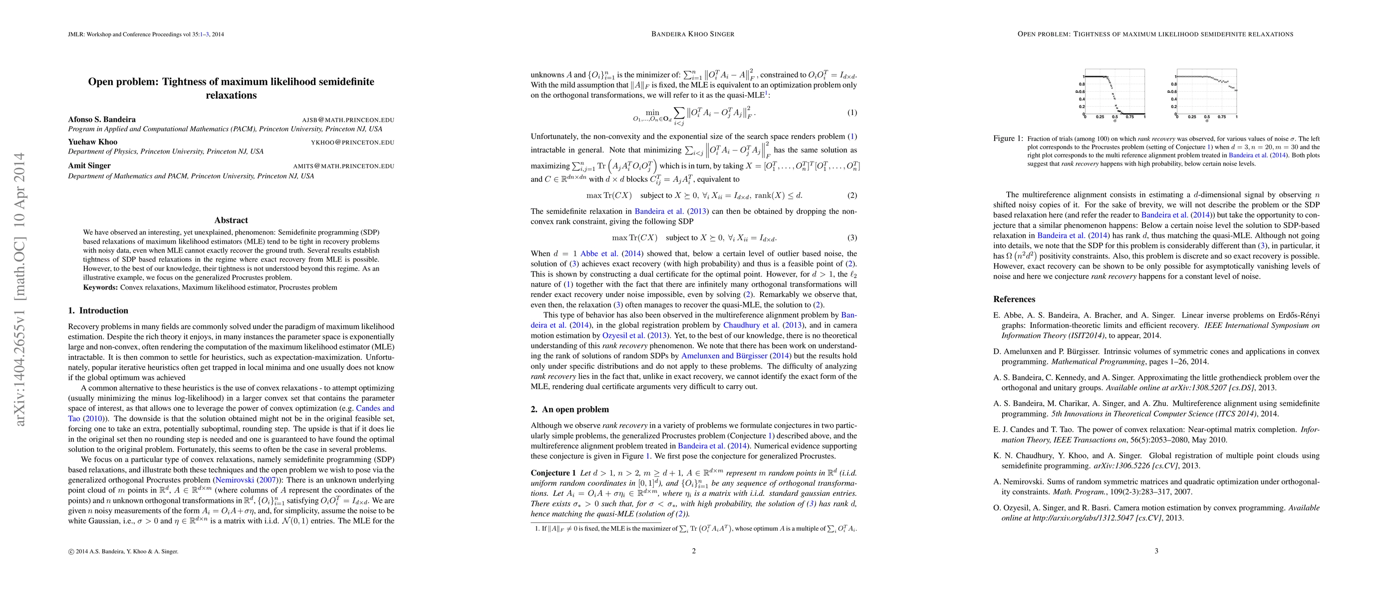 Summary: The paper investigates the unexplained phenomenon of tight semidefinite programming (SDP) relaxations for maximum likelihood estimators (MLE) in noisy data recovery problems, even when MLE fails to recover the ground truth. The study highlights the lack of understanding regarding the tightness of these SDP relaxations beyond the regime where exact recovery from MLE is feasible, using the generalized Procrustes problem as an example.