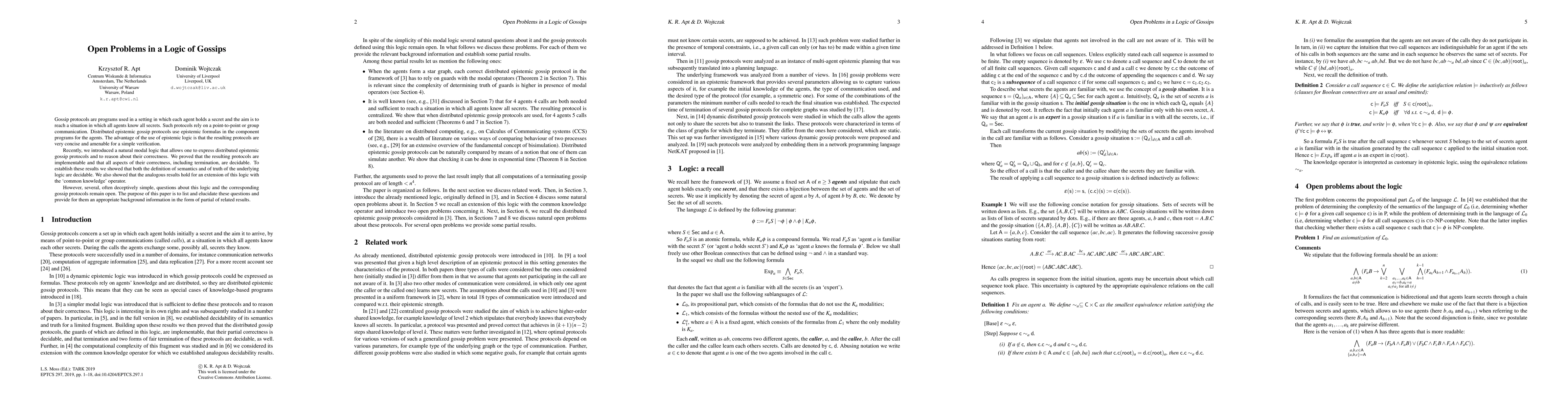 This paper introduces a modal logic for expressing and verifying distributed epistemic gossip protocols, proving their implementability and correctness. It highlights several open problems regarding the logic and protocols, aiming to stimulate further research by providing background information and partial results.
