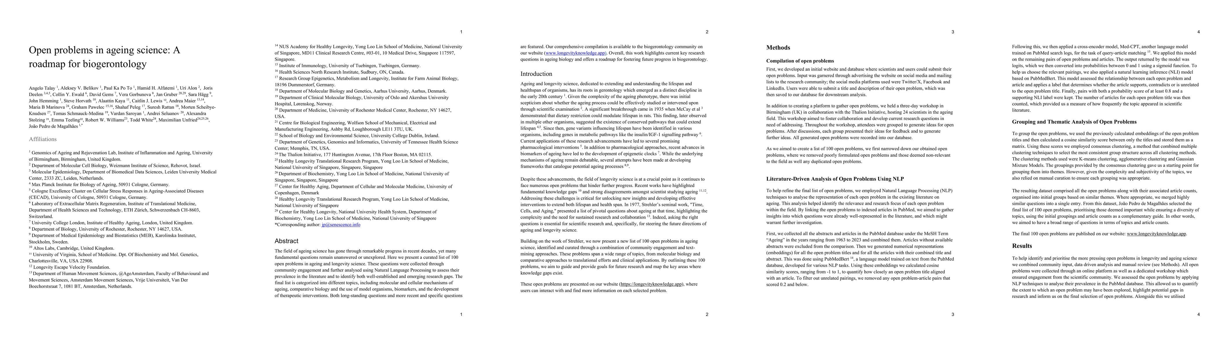 The field of ageing science has gone through remarkable progress in recent decades, yet many fundamental questions remain unanswered or unexplored. Here we present a curated list of 100 open problems in ageing and longevity science. These questions were collected through community engagement and further analysed using Natural Language Processing to assess their prevalence in the literature and to identify both well-established and emerging research gaps. The final list is categorized into different topics, including molecular and cellular mechanisms of ageing, comparative biology and the use of model organisms, biomarkers, and the development of therapeutic interventions. Both long-standing questions and more recent and specific questions are featured. Our comprehensive compilation is available to the biogerontology community on our website (www.longevityknowledge.app). Overall, this work highlights current key research questions in ageing biology and offers a roadmap for fostering future progress in biogerontology.