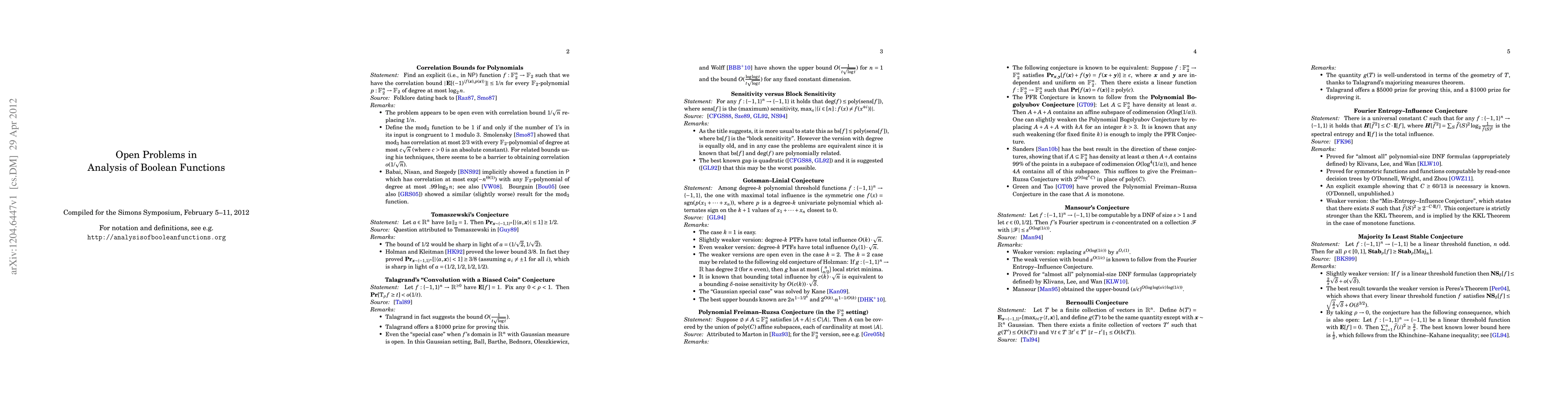 A list of open problems in the field of analysis of boolean functions, compiled February 2012 for the Simons Symposium.