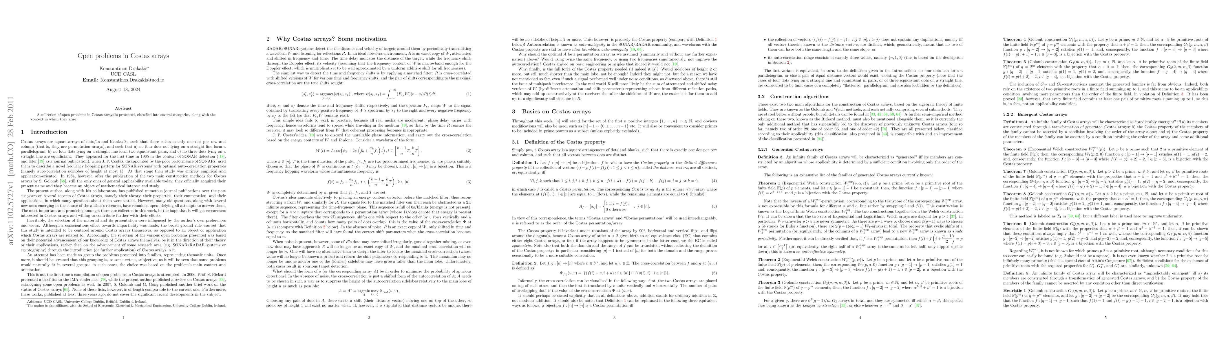 This paper presents open problems in Costas arrays, categorizing them into several areas and highlighting their relevance to various fields. It aims to stimulate research and discussion among experts in the field of combinatorial design theory and coding theory.