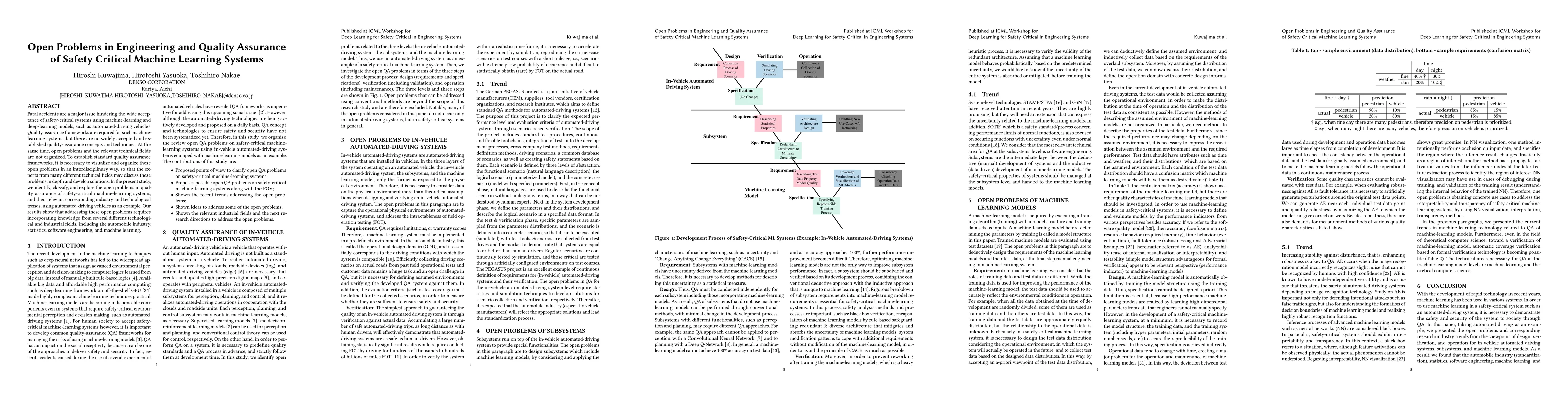 This paper identifies and classifies open problems in the quality assurance of safety-critical machine learning systems, particularly focusing on automated-driving vehicles. It emphasizes the need for interdisciplinary collaboration to develop solutions, highlighting the involvement of fields such as automotive, statistics, software engineering, and machine learning.