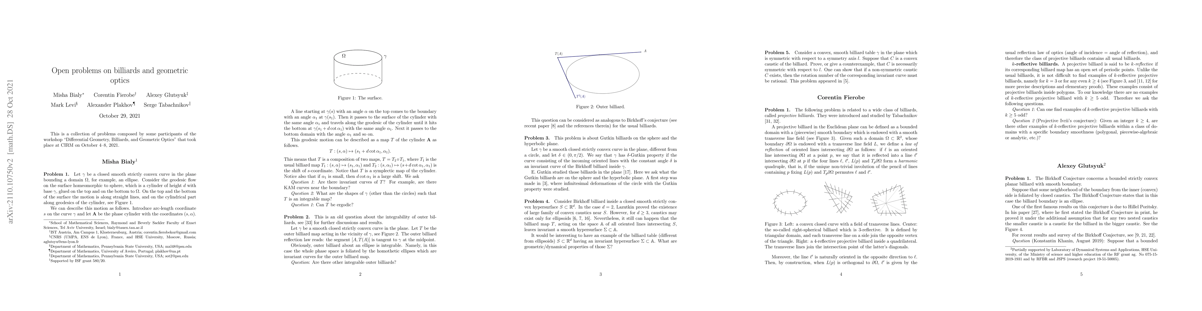 This is a collection of open problems from workshop "Differential Geometry, Billiards, and Geometric Optics" at CIRM on October 4-8, 2021.