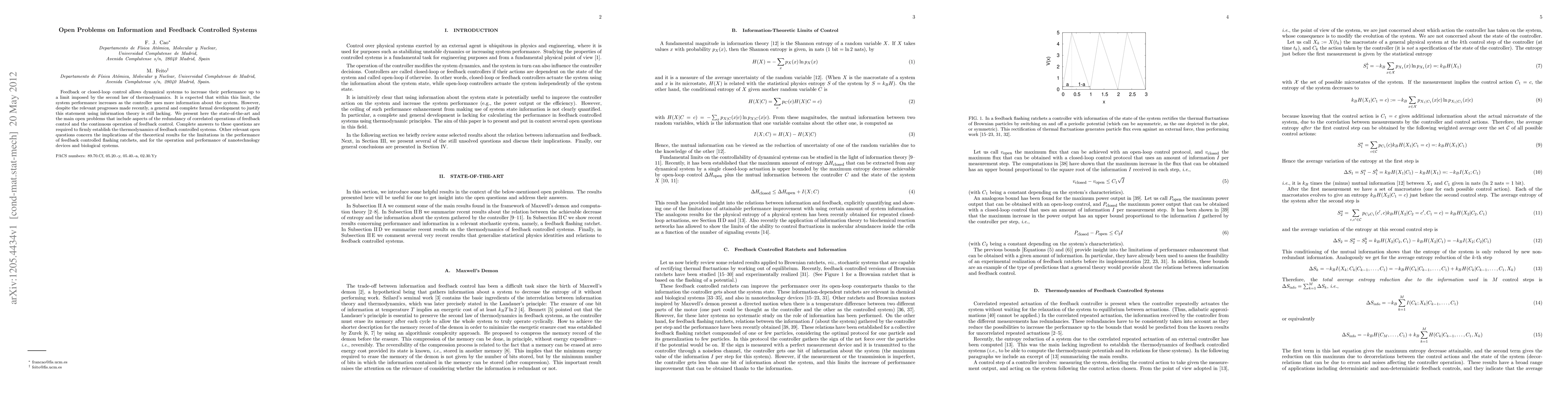 Feedback or closed-loop control allows dynamical systems to increase their performance up to a limit imposed by the second law of thermodynamics. It is expected that within this limit, the system performance increases as the controller uses more information about the system. However, despite the relevant progresses made recently, a general and complete formal development to justify this statement using information theory is still lacking. We present here the state-of-the-art and the main open problems that include aspects of the redundancy of correlated operations of feedback control and the continuous operation of feedback control. Complete answers to these questions are required to firmly establish the thermodynamics of feedback controlled systems. Other relevant open questions concern the implications of the theoretical results for the limitations in the performance of feedback controlled flashing ratchets, and for the operation and performance of nanotechnology devices and biological systems.