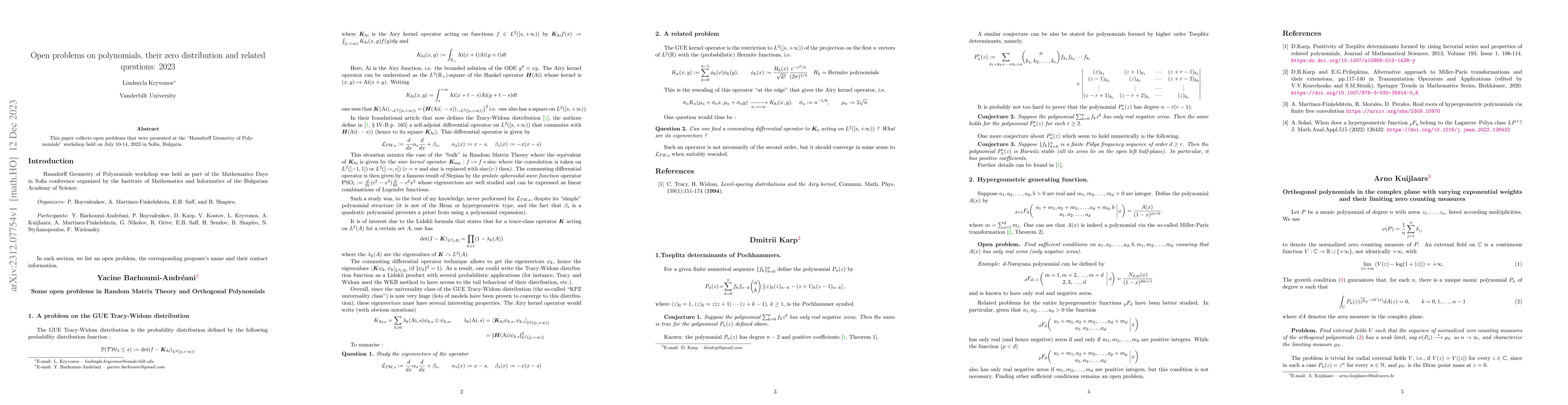 This paper collects open problems that were presented at the ``Hausdorff Geometry of Polynomials" workshop held on July 10-14, 2023 in Sofia, Bulgaria.