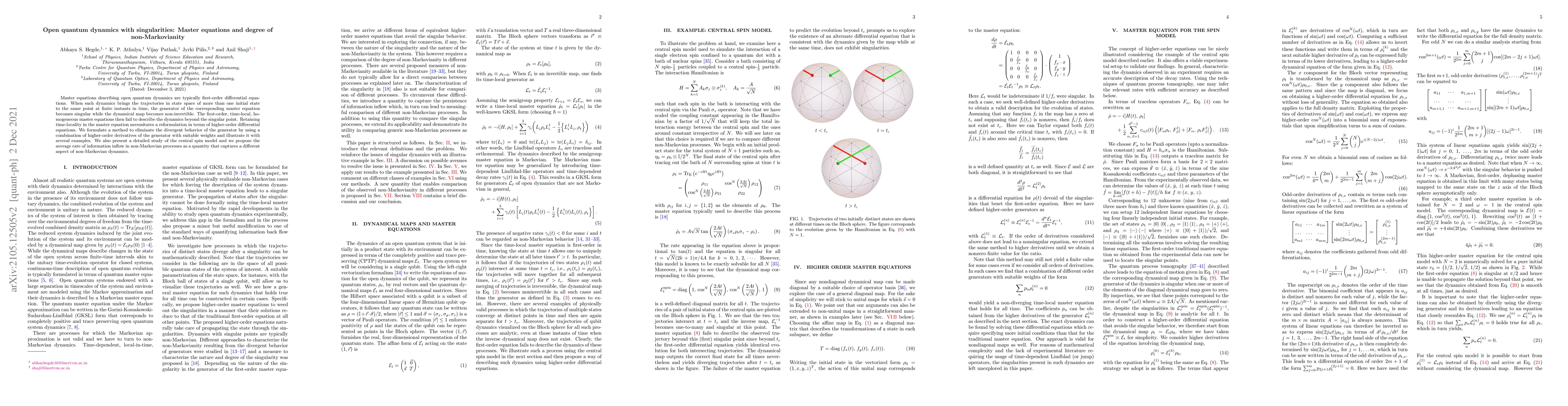 This paper discusses open quantum dynamics with singularities, where first-order master equations fail to describe the system beyond certain points. It introduces a method using higher-order derivatives to reformulate the master equation, maintaining time-locality. The research also explores the central spin model and proposes a new measure for non-Markovian dynamics based on the average rate of information inflow.