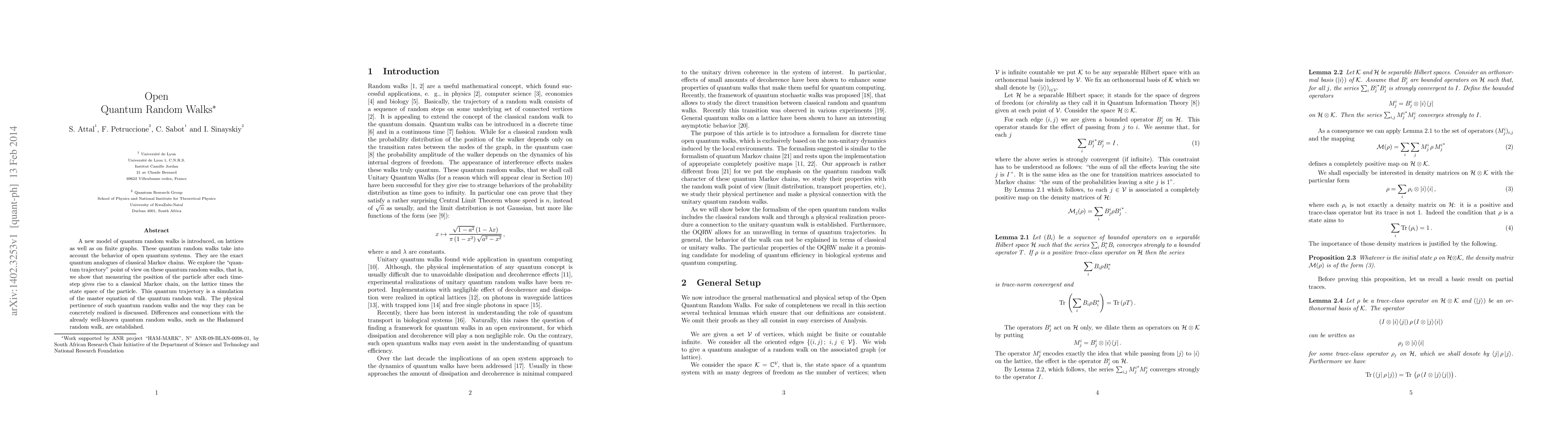 This paper introduces a new model of quantum random walks on lattices and finite graphs, accounting for open quantum system behavior. It explores the "quantum trajectory" viewpoint, showing that measurements produce classical Markov chains, simulating the master equation of quantum random walks, and discusses their physical realization and differences from existing models like the Hadamard random walk.
