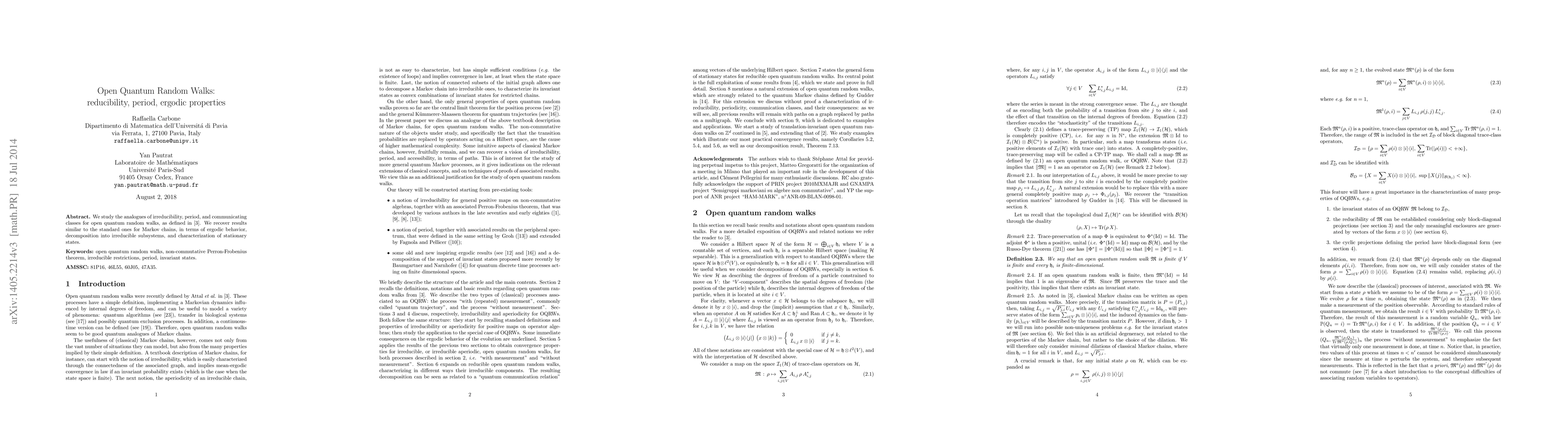 This paper studies open quantum random walks, exploring reducibility, period, and ergodic properties, with findings similar to those for Markov chains in terms of stationary states and subsystem decomposition.