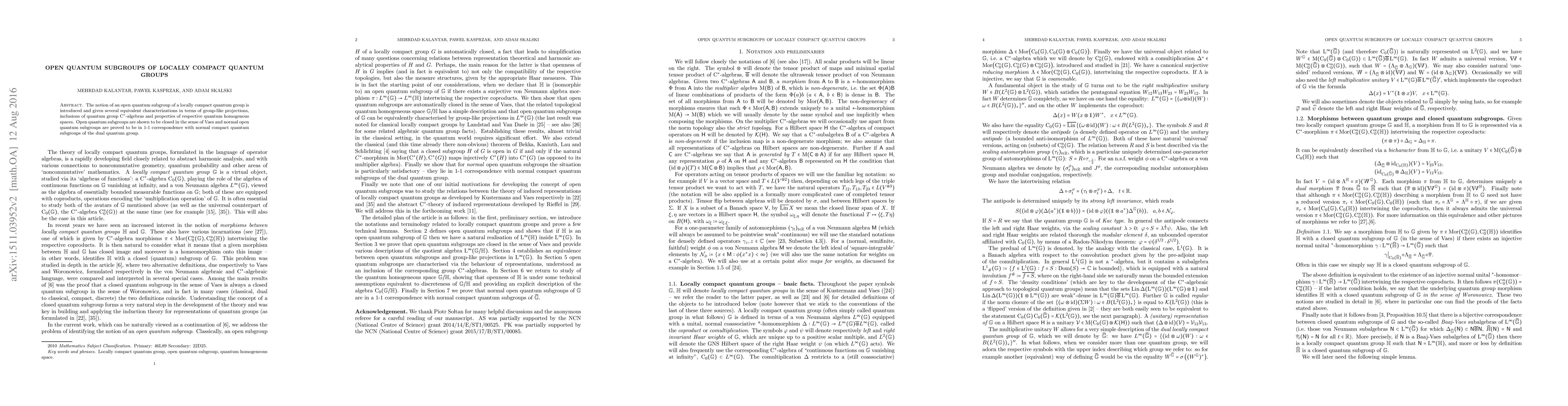 This paper introduces open quantum subgroups of locally compact quantum groups, providing equivalent characterizations and proving that they are closed in the sense of Vaes. It further establishes a one-to-one correspondence between normal open quantum subgroups and normal compact quantum subgroups of the dual quantum group.