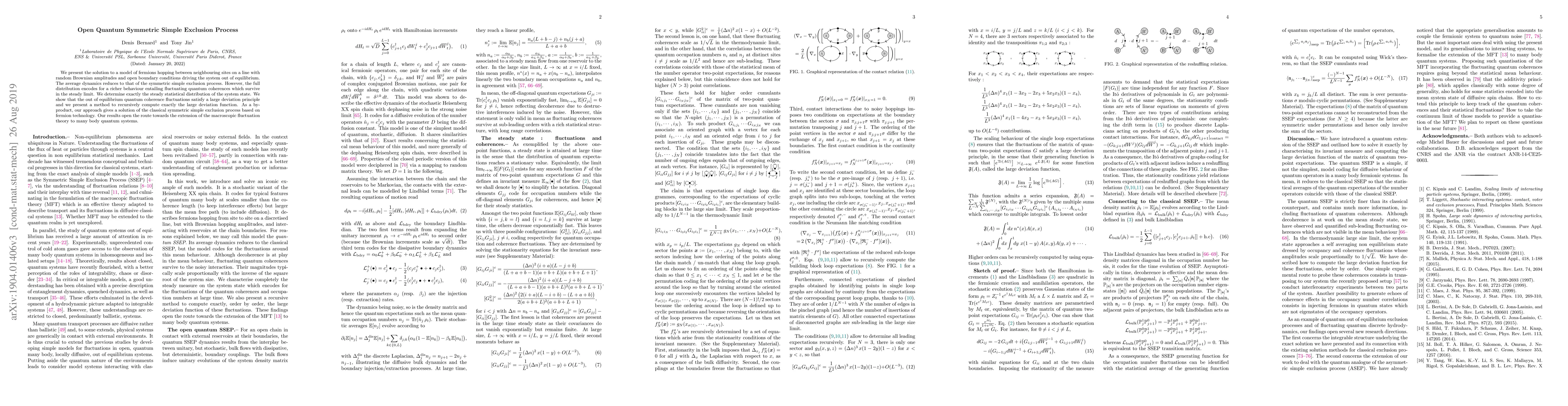 We introduce and solve a model of fermions hopping between neighbouring sites on a line with random Brownian amplitudes and open boundary conditions driving the system out of equilibrium. The average dynamics reduces to that of the symmetric simple exclusion process. However, the full distribution encodes for a richer behaviour entailing fluctuating quantum coherences which survive in the steady limit. We determine exactly the system state steady distribution. We show that these out of equilibrium quantum fluctuations fulfil a large deviation principle and we present a method to recursively compute exactly the large deviation function. On the way, our approach gives a solution of the classical symmetric simple exclusion process using fermion technology. Our results open the route towards the extension of the macroscopic fluctuation theory to many body quantum systems.