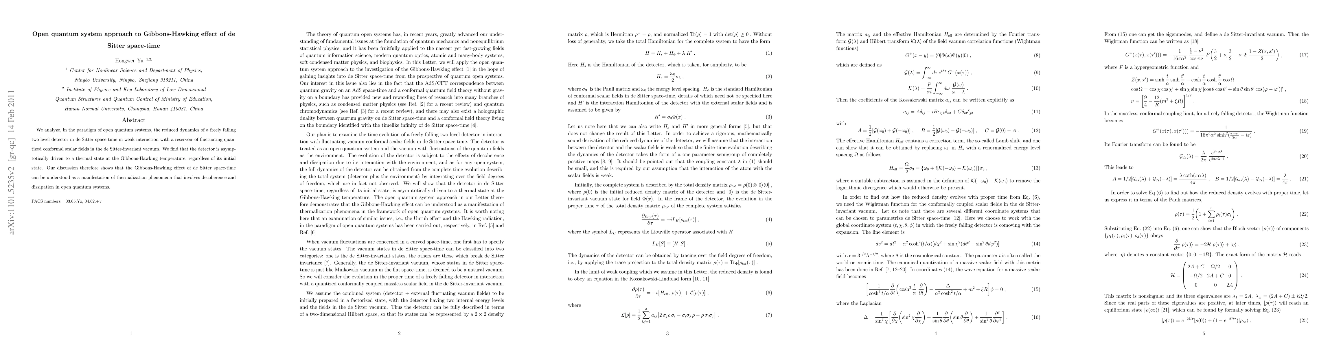 This paper explores the Gibbons-Hawking effect in de Sitter space-time using open quantum systems, demonstrating that a freely-falling detector asymptotically reaches a thermal state at the Gibbons-Hawking temperature due to interaction with fluctuating fields, highlighting thermalization through decoherence and dissipation.