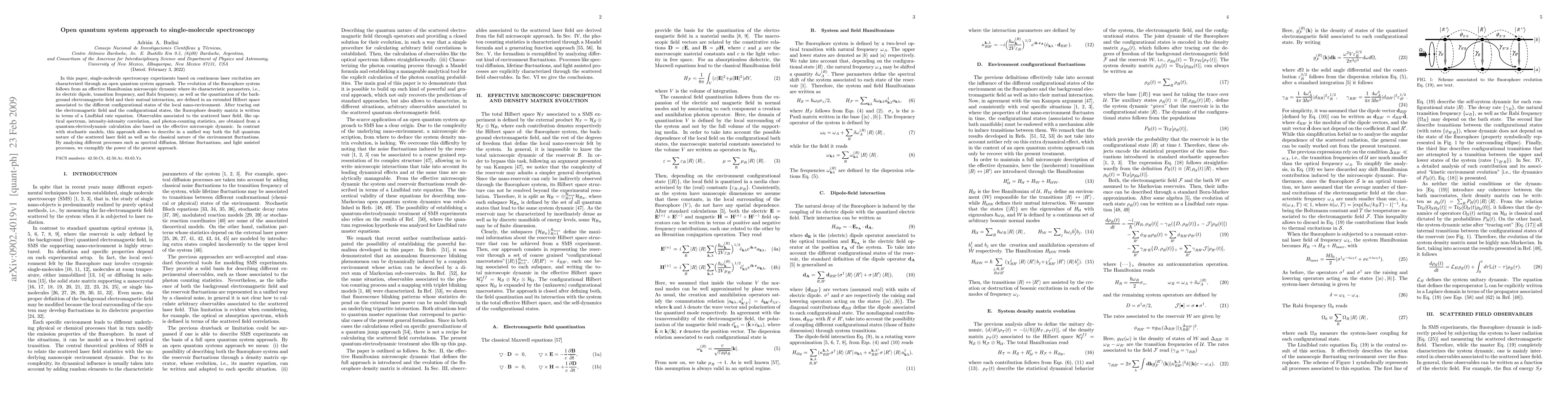 In this paper, single-molecule spectroscopy experiments based on continuous laser excitation are characterized through an open quantum system approach. The evolution of the fluorophore system follows from an effective Hamiltonian microscopic dynamic where its characteristic parameters, i.e., its electric dipole, transition frequency, and Rabi frequency, as well as the quantization of the background electromagnetic field and their mutual interaction, are defined in an extended Hilbert space associated to the different configurational states of the local nano-environment. After tracing out the electromagnetic field and the configurational states, the fluorophore density matrix is written in terms of a Lindblad rate equation. Observables associated to the scattered laser field, like optical spectrum, intensity-intensity correlation, and photon-counting statistics, are obtained from a quantum-electrodynamic calculation also based on the effective microscopic dynamic. In contrast with stochastic models, this approach allows to describe in a unified way both the full quantum nature of the scattered laser field as well as the classical nature of the environment fluctuations. By analyzing different processes such as spectral diffusion, lifetime fluctuations, and light assisted processes, we exemplify the power of the present approach.