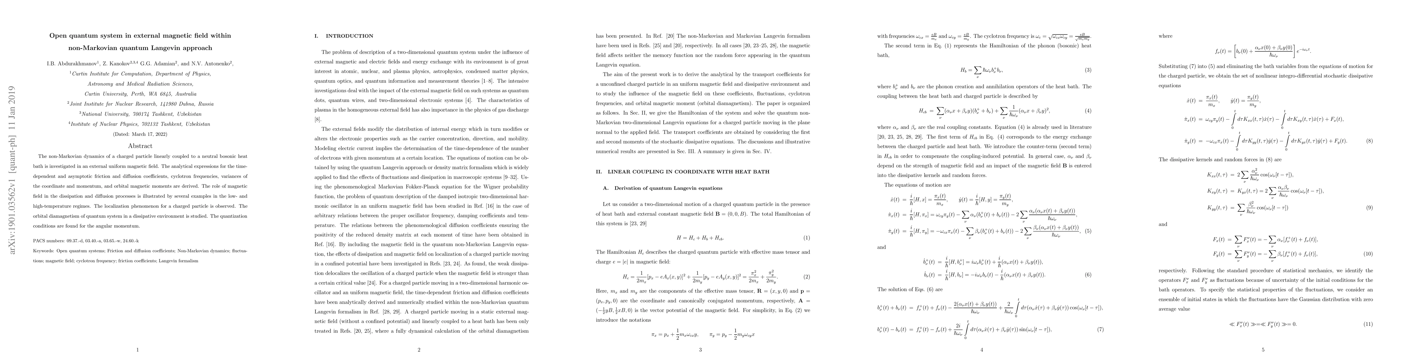 The non-Markovian dynamics of a charged particle linearly coupled to a neutral bosonic heat bath is investigated in an external uniform magnetic field. The analytical expressions for the time-dependent and asymptotic friction and diffusion coefficients, cyclotron frequencies, variances of the coordinate and momentum, and orbital magnetic moments are derived. The role of magnetic field in the dissipation and diffusion processes is illustrated by several examples in the low- and high-temperature regimes. The localization phenomenon for a charged particle is observed. The orbital diamagnetism of quantum system in a dissipative environment is studied. The quantization conditions are found for the angular momentum.