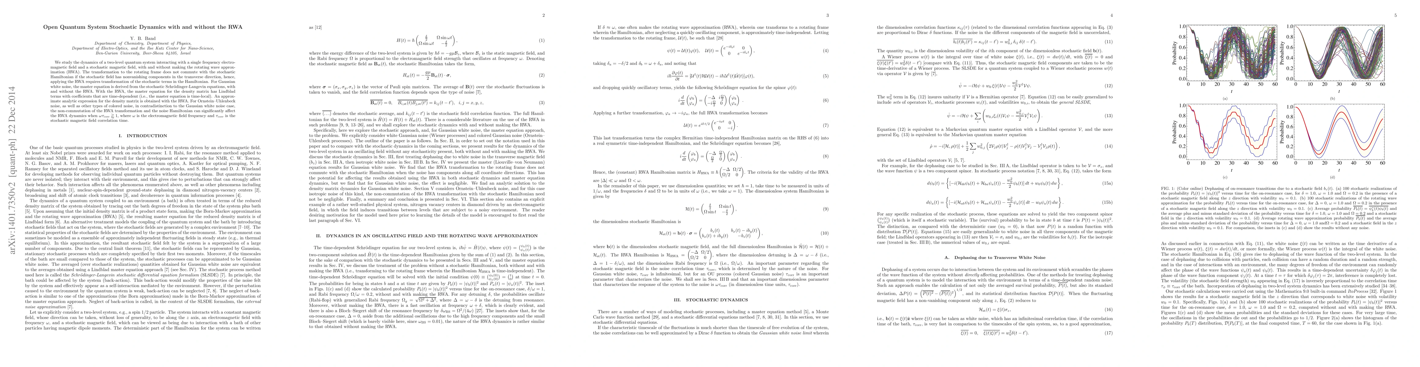 We study the stochastic dynamics of a two-level quantum system interacting with a stochastic magnetic field, and a single frequency electromagnetic field, with and without making the rotating wave approximation (RWA). The transformation to the rotating frame does not commute with the stochastic Hamiltonian if the stochastic field has nonvanishing components in the transverse direction. Hence, making the RWA modifies the stochastic terms in the Hamiltonian. Modification of the decay terms is also required in a master equation approach (i.e., the Liouville--von Neumann density matrix equation) for describing the dynamics. For isotropic Gaussian white noise, the RWA dynamics remains Markovian, although the Lindblad terms in the master equation for the density matrix become time-dependent when the non-commutation of the RWA transformation and the noise Hamiltonian is properly accounted for. We also treat Ornstein--Uhlenbeck noise, and find, in contra-distinction to the white noise case, a significant difference in the dynamics calculated with the RWA when the non-commutation of the RWA transformation and the noise Hamiltonian is taken into account. These findings are applicable to the modeling of any open quantum system coupled to an electromagentic field.