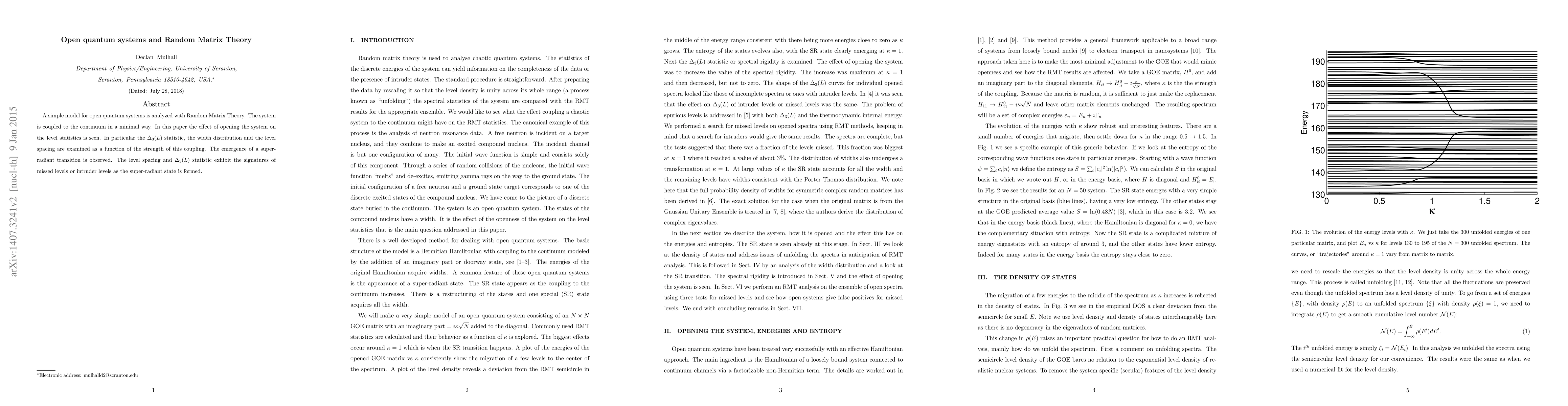 This paper analyzes an open quantum system using Random Matrix Theory, revealing how coupling to a continuum influences level statistics, including the $\Delta_3(L)$ statistic, width distribution, and level spacing. A super-radiant transition is observed, marked by the emergence of missed levels in the level spacing and $\Delta_3(L)$ statistic.