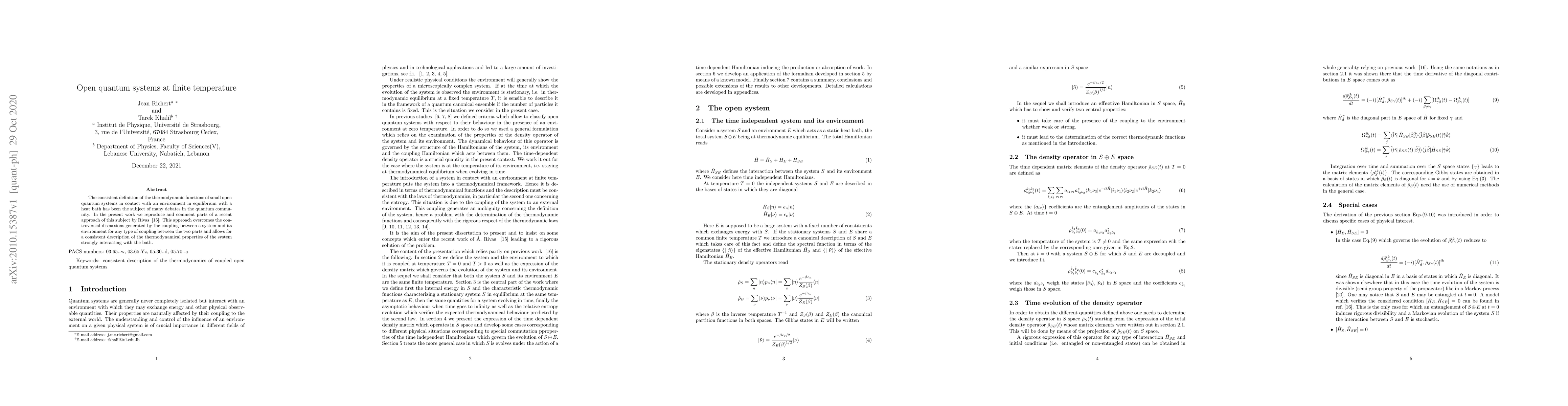 The consistent definition of the thermodynamic functions of small open quantum systems in contact with an environment in equilibrium with a heat bath has been the subject of many debates in the quantum community. In the present work we reproduce and comment parts of a recent approach of this subject by Rivas [15]. This approach overcomes the controversial discussions generated by the coupling between a system and its environment for any type of coupling between the two parts and allows for a consistent description of the thermodynamical properties of the system strongly interacting with the bath