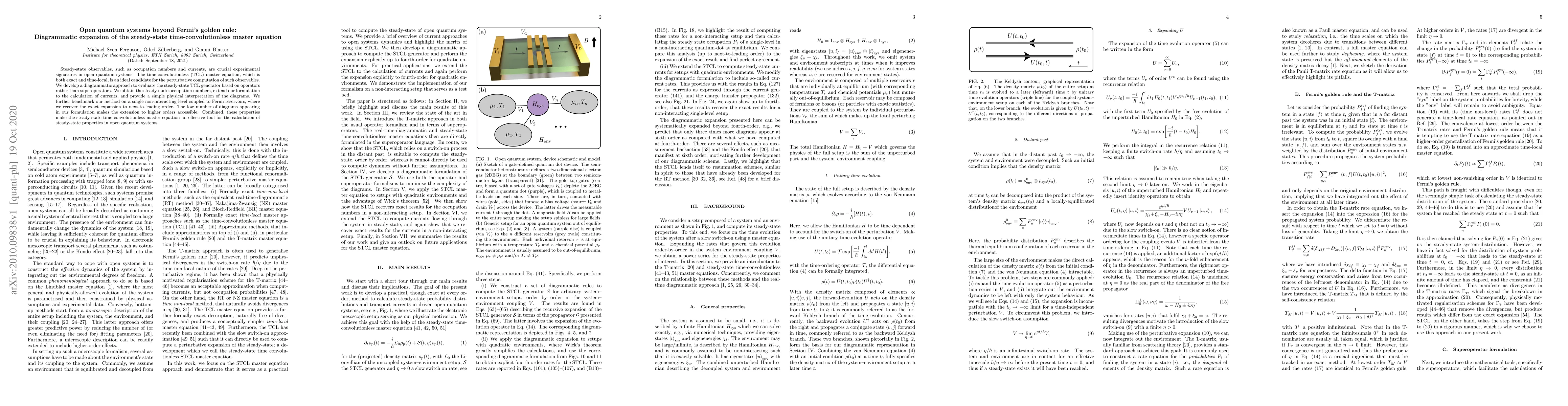 This paper develops a diagrammatic method to compute steady-state observables in open quantum systems using the time-convolutionless master equation, extending it to occupation numbers and currents, and demonstrating its effectiveness with a simple model system. The method's simplicity and low-diagram count facilitate higher-order calculations.