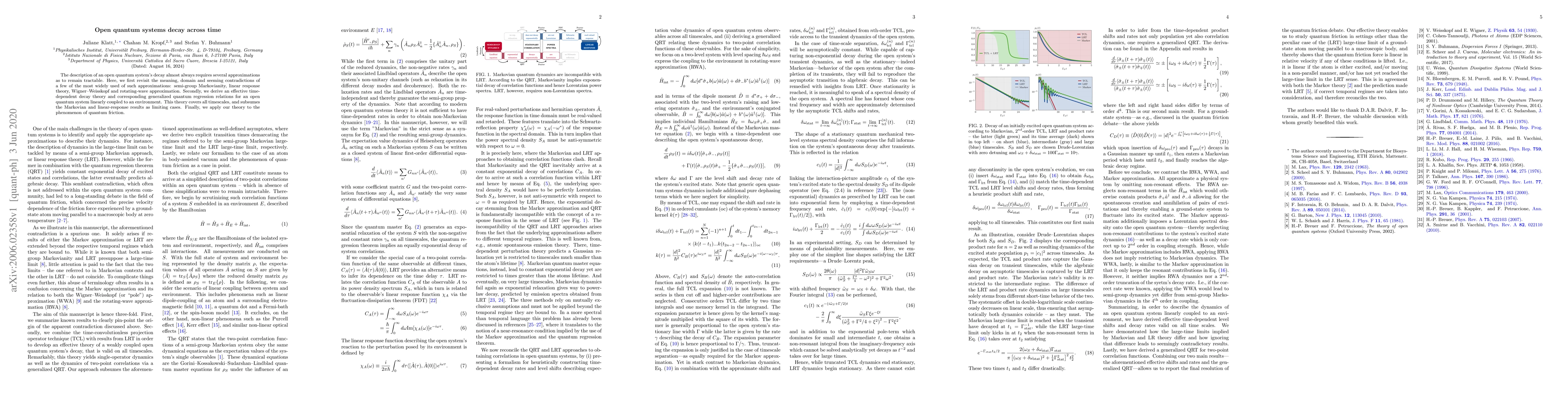 The description of an open quantum system's decay almost always requires several approximations as to remain tractable. Here, we first revisit the meaning, domain and seeming contradictions of a few of the most widely used of such approximations: semi-group Markovianity, linear response theory, Wigner--Weisskopf and rotating-wave approximation. Secondly, we derive an effective time-dependent decay theory and corresponding generalized quantum regression relations for an open quantum system linearly coupled to an environment. This theory covers all timescales, and subsumes the Markovian and linear-response results as limiting cases. Finally, we apply our theory to the phenomenon of quantum friction.