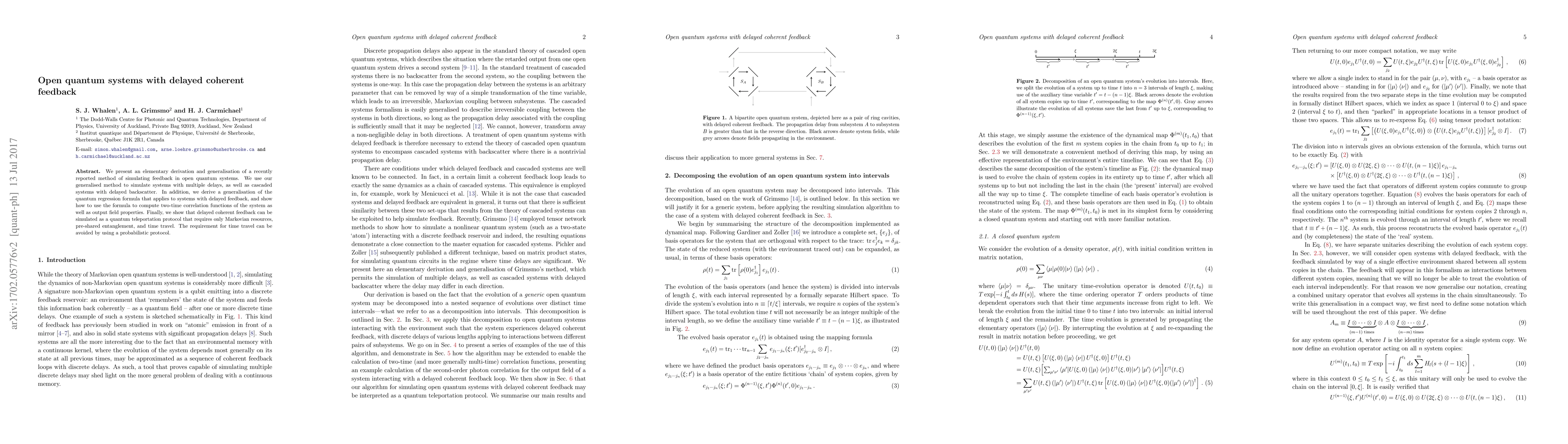 We present an elementary derivation and generalisation of a recently reported method of simulating feedback in open quantum systems. We use our generalised method to simulate systems with multiple delays, as well as cascaded systems with delayed backscatter. In addition, we derive a generalisation of the quantum regression formula that applies to systems with delayed feedback, and show how to use the formula to compute two-time correlation functions of the system as well as output field properties. Finally, we show that delayed coherent feedback can be simulated as a quantum teleportation protocol that requires only Markovian resources, pre-shared entanglement, and time travel. The requirement for time travel can be avoided by using a probabilistic protocol.