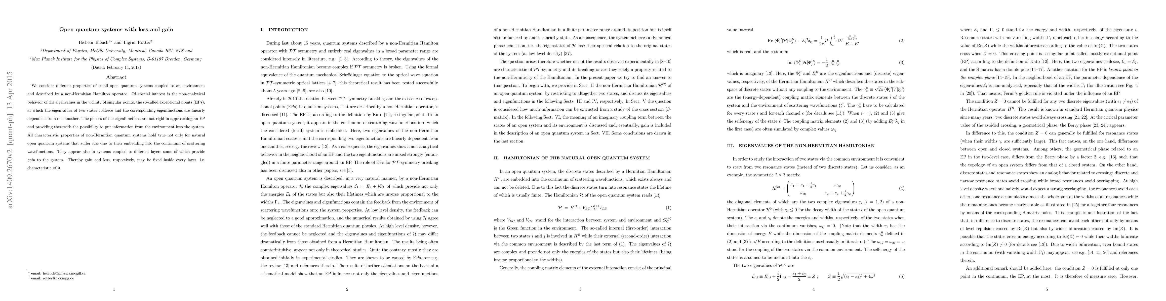We consider different properties of small open quantum systems coupled to an environment and described by a non-Hermitian Hamilton operator. Of special interest is the non-analytical behavior of the eigenvalues in the vicinity of singular points, the so-called exceptional points (EPs), at which the eigenvalues of two states coalesce and the corresponding eigenfunctions are linearly dependent from one another. The phases of the eigenfunctions are not rigid in approaching an EP and providing therewith the possibility to put information from the environment into the system. All characteristic properties of non-Hermitian quantum systems hold true not only for natural open quantum systems that suffer loss due to their embedding into the continuum of scattering wavefunctions. They appear also in systems coupled to different layers some of which provide gain to the system. Thereby gain and loss, respectively, may be fixed inside every layer, i.e. characteristic of it.