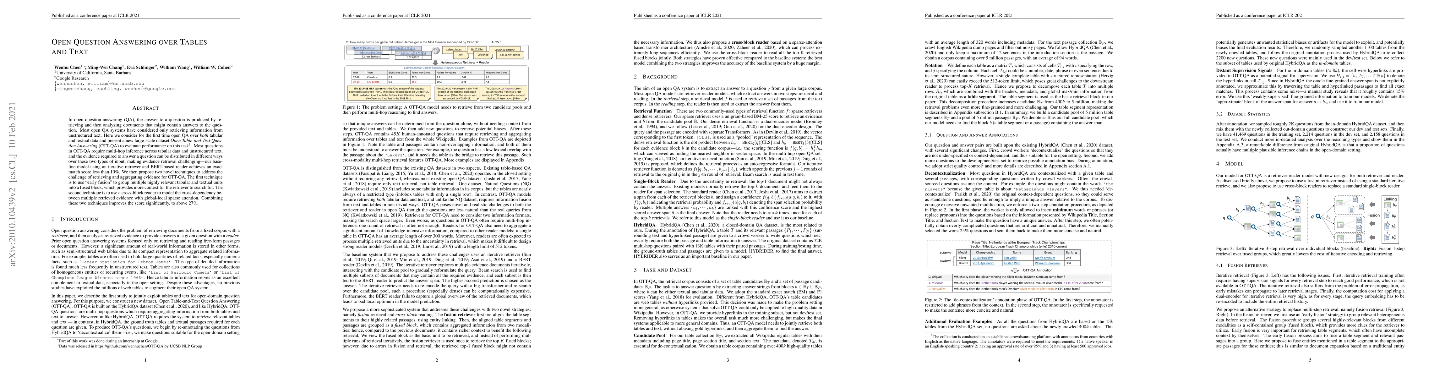 This paper introduces a new dataset, OTT-QA, for open question answering over both tabular and textual data, highlighting the challenges of multi-hop inference. The authors propose two techniques to improve performance: early fusion of relevant tabular and textual units and a cross-block reader with global-local sparse attention, which together boost exact match scores from below 10% to above 27%.