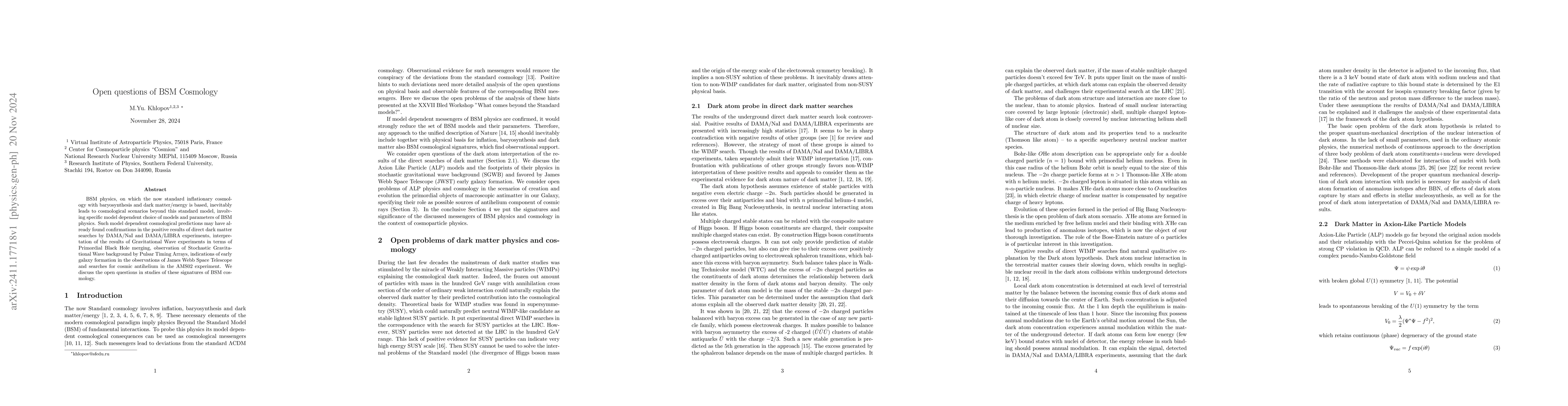 BSM physics, on which the now standard inflationary cosmology with baryosynthesis and dark matter/energy is based, inevitably leads to cosmological scenarios beyond this standard model, involving specific model dependent choice of models and parameters of BSM physics. Such model dependent cosmological predictions may have already found confirmations in the positive results of direct dark matter searches by DAMA/NaI and DAMA/LIBRA experiments, interpretation of the results of Gravitational Wave experiments in terms of Primordial Black Hole merging, observation of Stochastic GravitationalWave background by Pulsar Timing Arrays, indications of early galaxy formation in the observations of James Webb Space Telescope and searches for cosmic antihelium in the AMS02 experiment. We discuss the open questions in studies of these signatures of BSM cosmology.