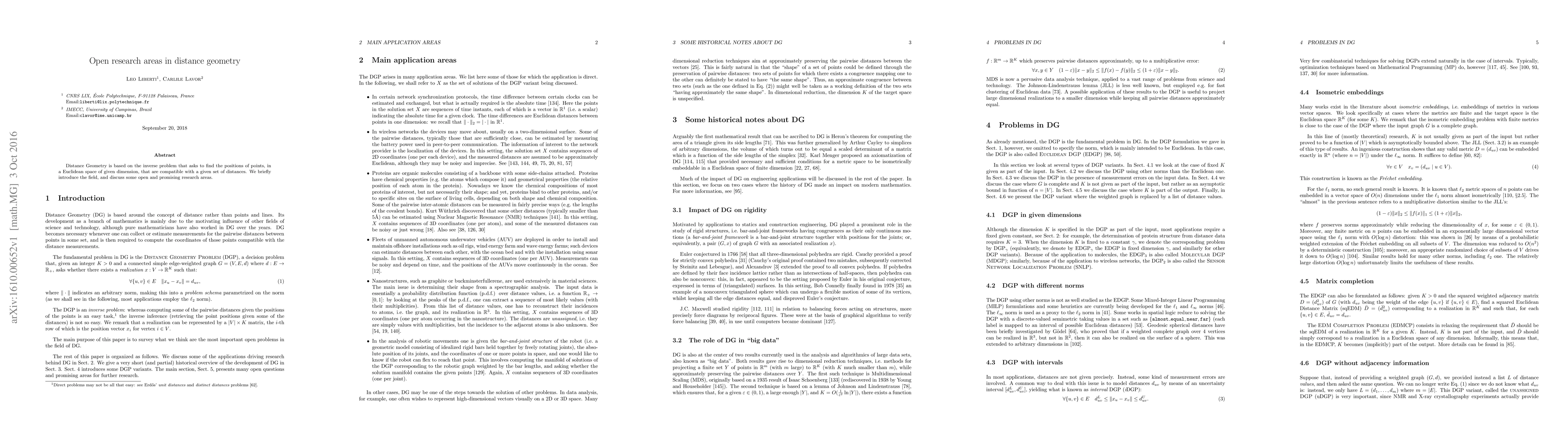 Distance Geometry is based on the inverse problem that asks to find the positions of points, in a Euclidean space of given dimension, that are compatible with a given set of distances. We briefly introduce the field, and discuss some open and promising research areas.