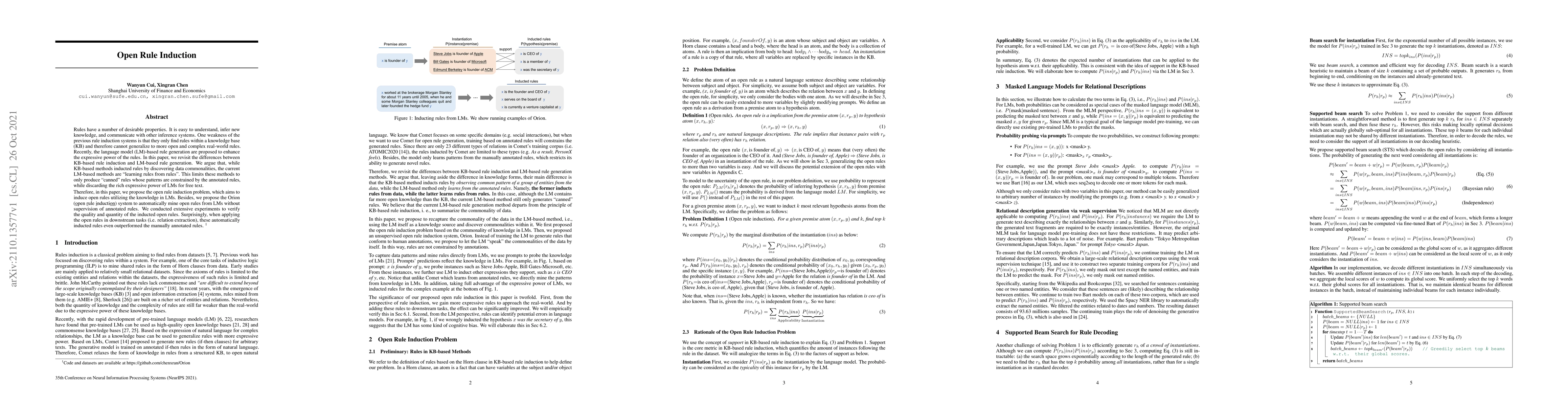 This paper proposes the open rule induction problem to generate rules that generalize beyond existing knowledge bases, introducing the Orion system to mine such rules from language models without relying on annotated rules. Experiments show that these automatically induced rules outperform manually annotated rules in downstream tasks like relation extraction.