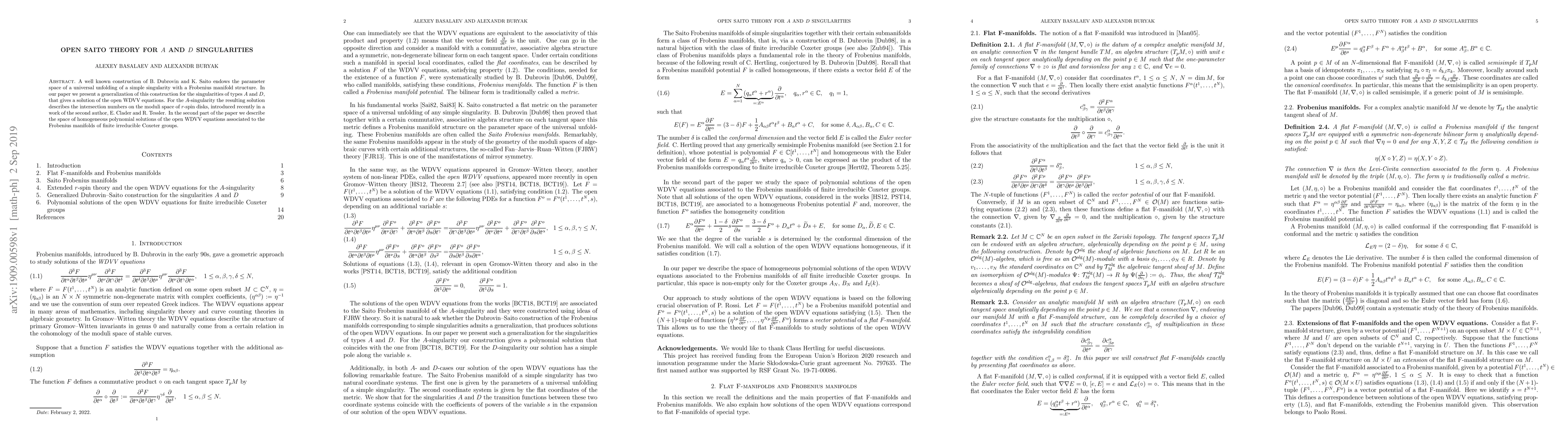 A well known construction of B. Dubrovin and K. Saito endows the parameter space of a universal unfolding of a simple singularity with a Frobenius manifold structure. In our paper we present a generalization of this construction for the singularities of types $A$ and $D$, that gives a solution of the open WDVV equations. For the $A$-singularity the resulting solution describes the intersection numbers on the moduli space of $r$-spin disks, introduced recently in a work of the second author, E. Clader and R. Tessler. In the second part of the paper we describe the space of homogeneous polynomial solutions of the open WDVV equations associated to the Frobenius manifolds of finite irreducible Coxeter groups.